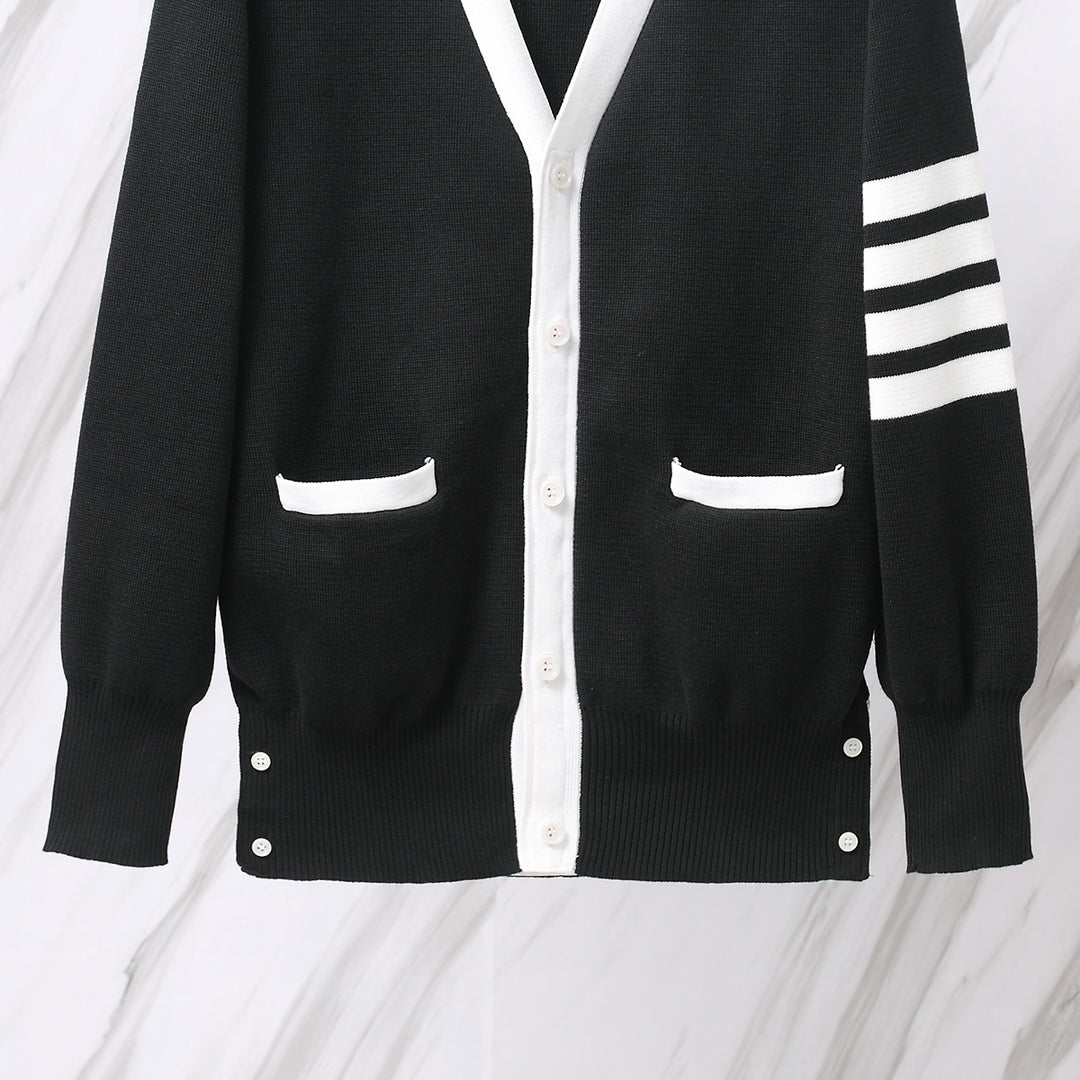 Introducing the Thom Browne TB M18 Contrast Striped Wool Blend Cardigan, a refined addition to your wardrobe. This expertly crafted piece showcases a thick knitted design adorned with the iconic four-bar stripes, perfect for both men and women.