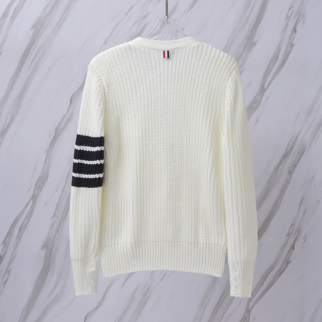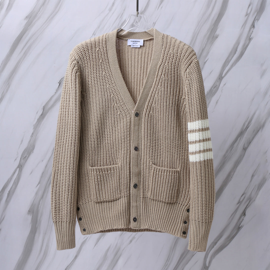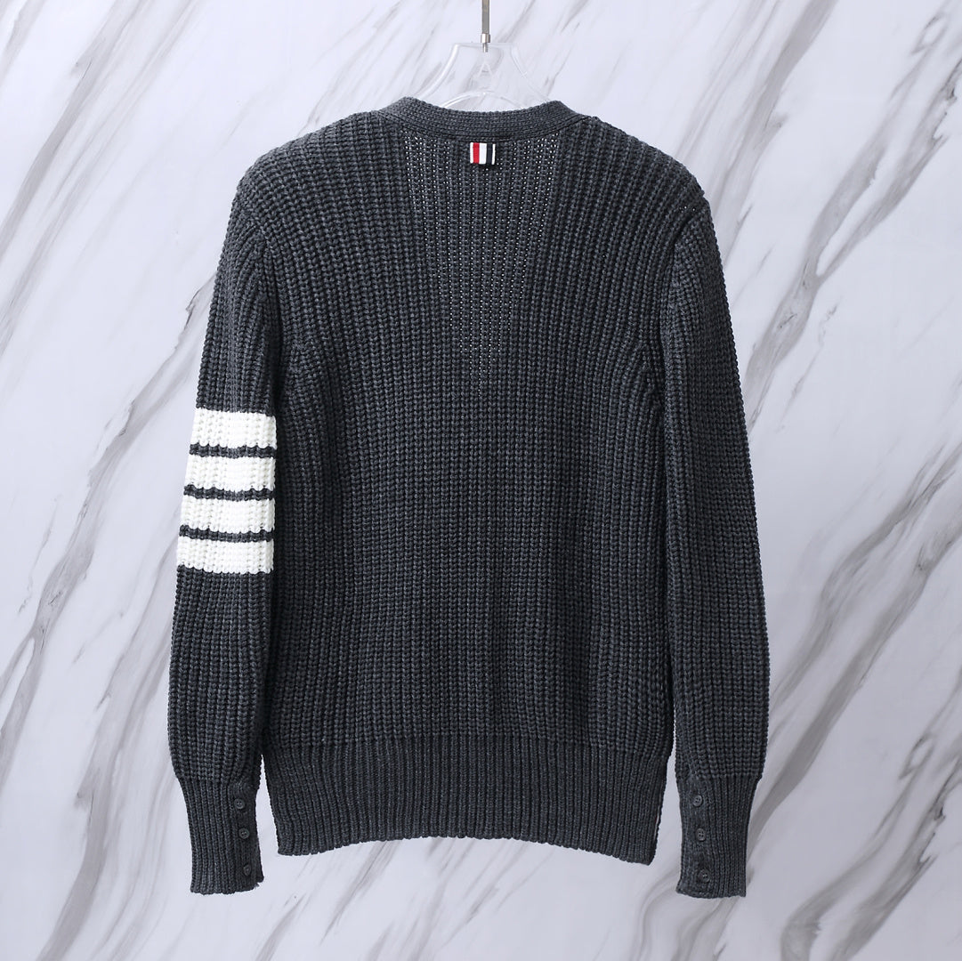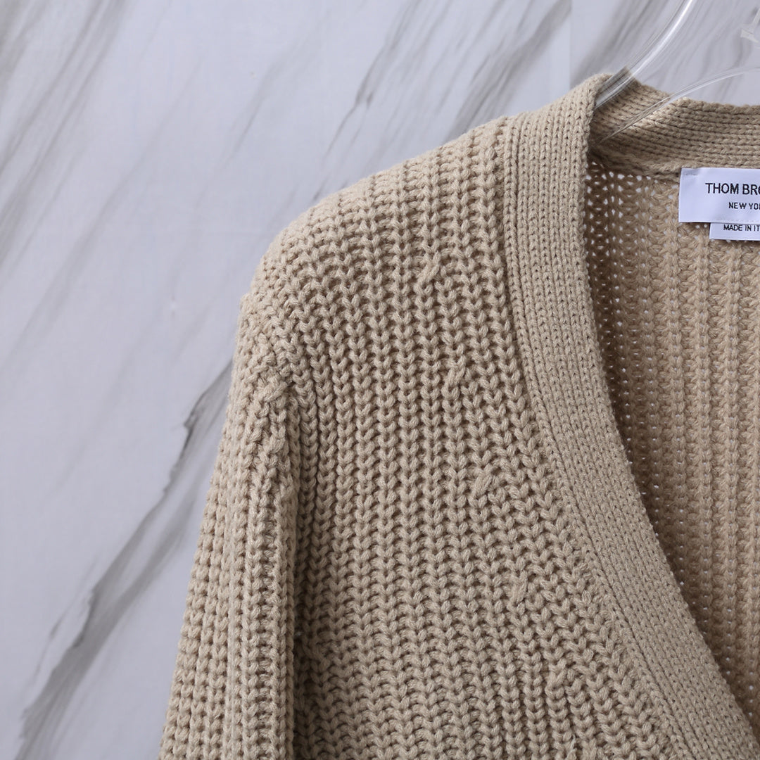 Elevate your wardrobe with the Thom Browne TB M42 Cardigan, a sophisticated piece crafted from a soft cashmere blend. This stylish cardigan features a classic four-button design and the signature four-stripe detail on the sleeves, embodying both elegance and comfort.
