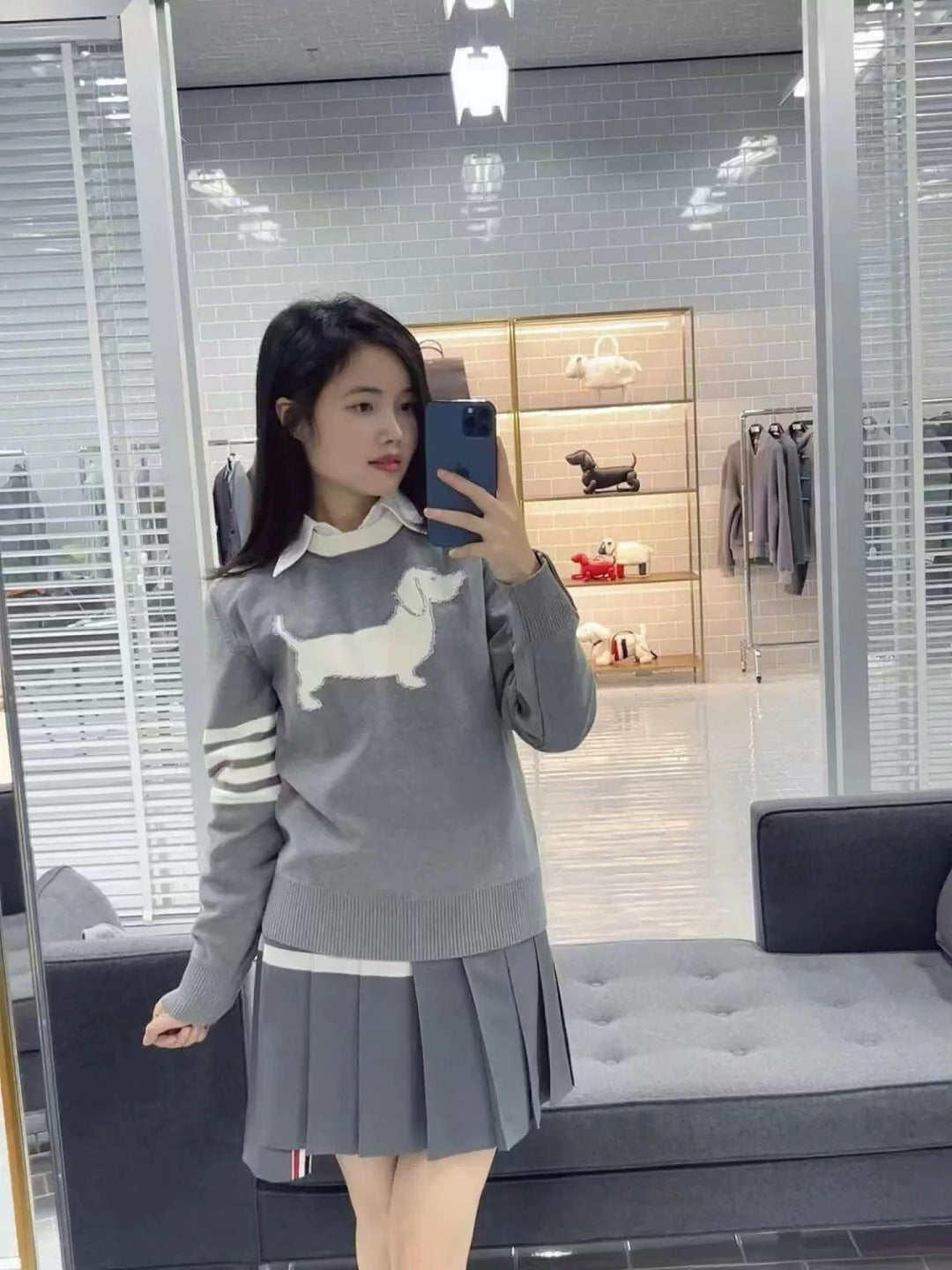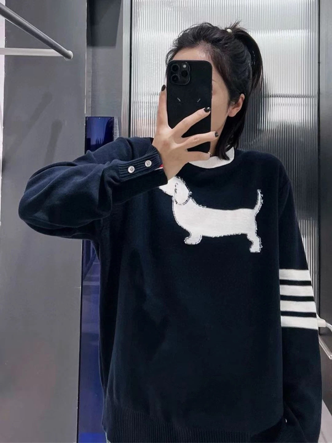 Elevate your wardrobe with the Thom Browne TB M45 Knitted Four-Bar Puppy Sweater. Crafted from a premium wool blend, this stylish crew neck sweater features a playful puppy pattern and a signature four-stripe design, ensuring a unique look for any occasion.