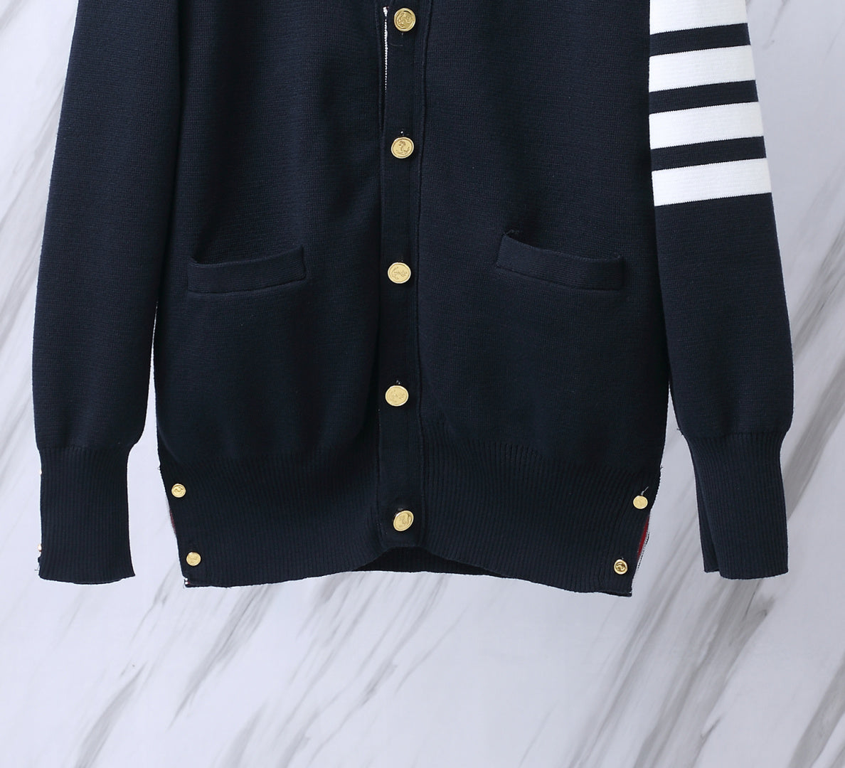 Designed using advanced knitting technology sourced from Japan, this cardigan boasts a tight stitch and unique four-stripe detailing on the sleeves, ensuring a classic yet contemporary look. Its soft and breathable fabric makes it comfortable for all-day wear, while the versatile design suits both men and women.