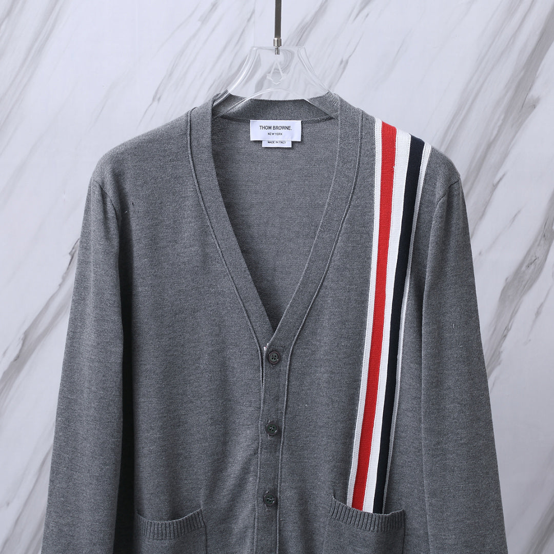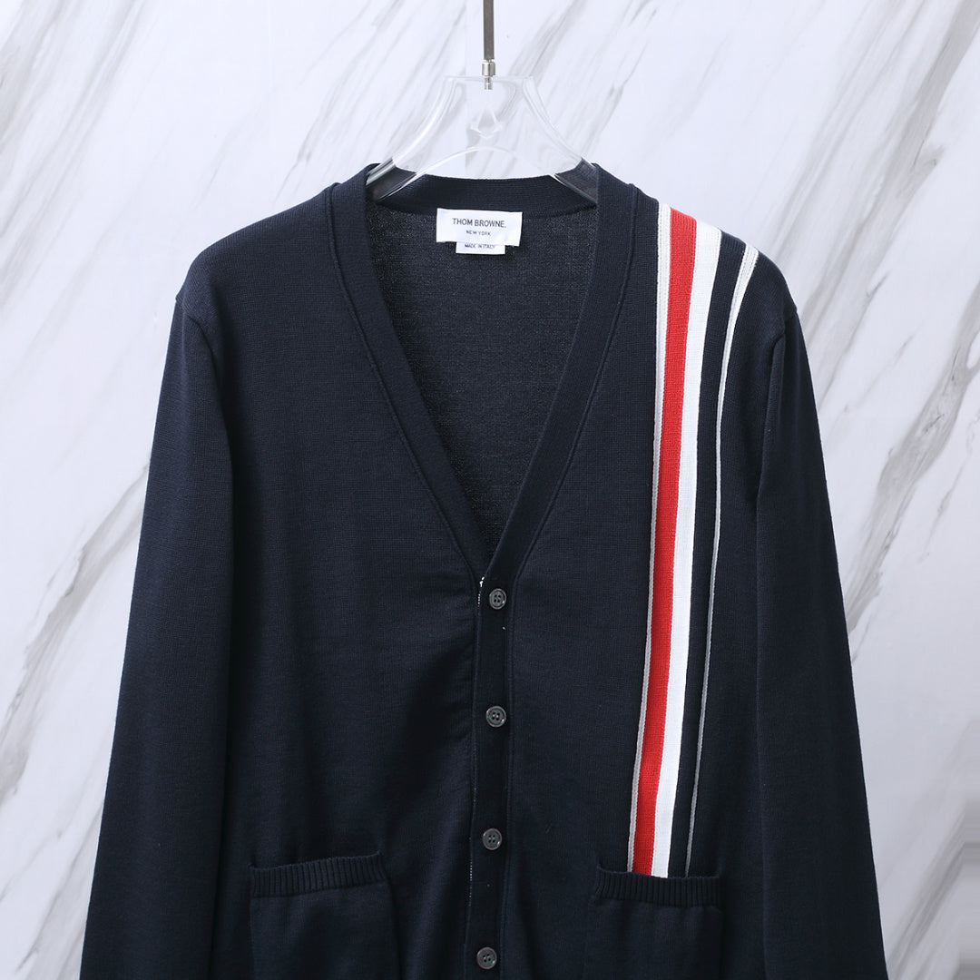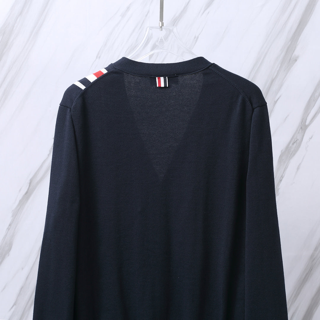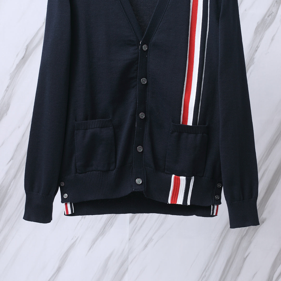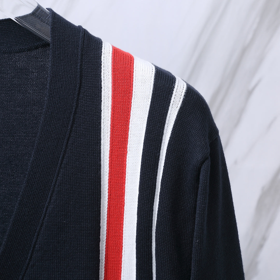 Elevate your wardrobe with the Thom Browne TB M36 V-neck cardigan sweater, a standout piece featuring a classic red, white, and blue design. Crafted from a premium wool blend, this full-body cardigan offers a soft and comfortable fit, perfect for year-round wear.