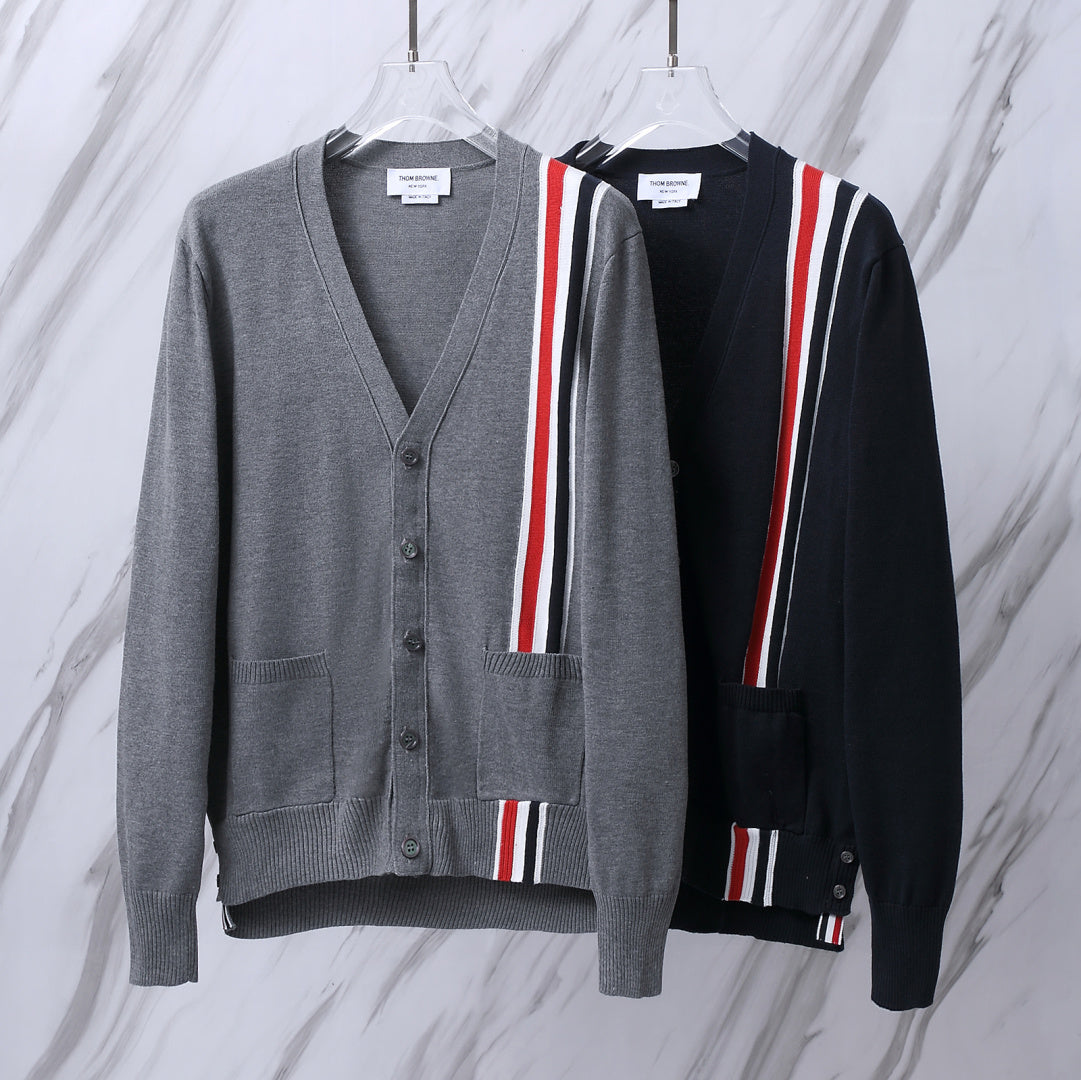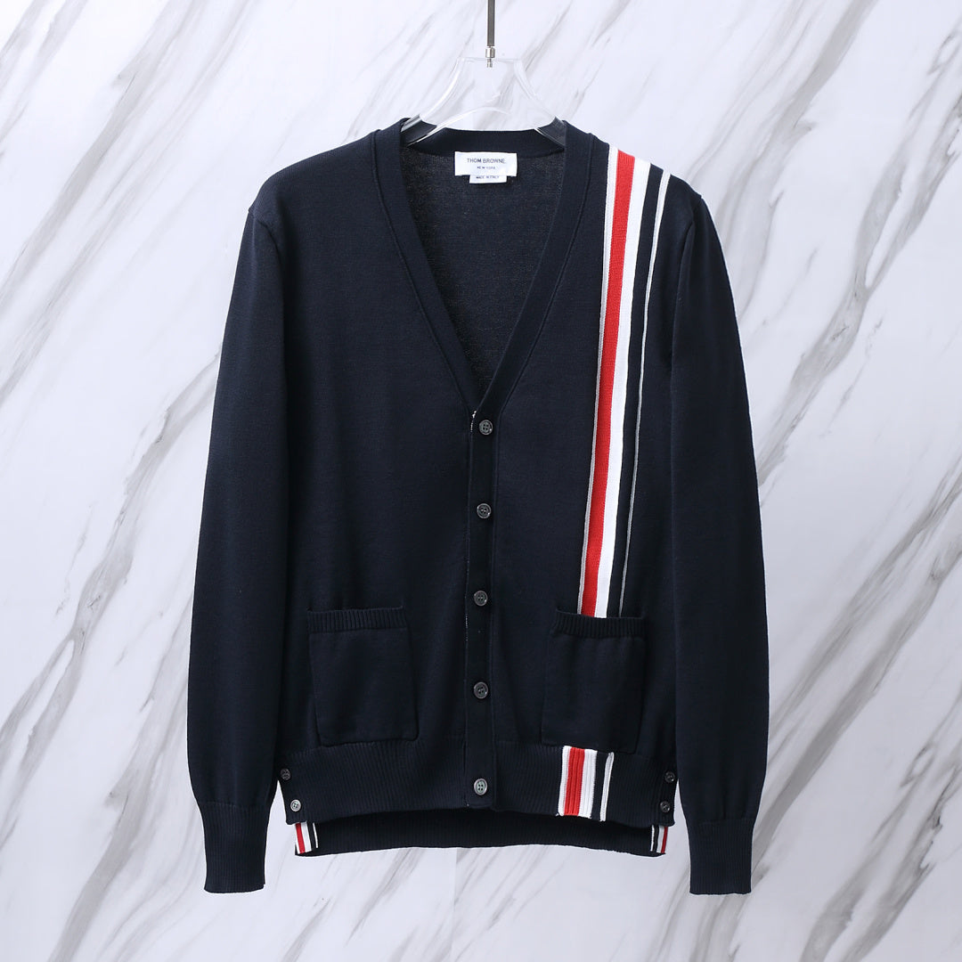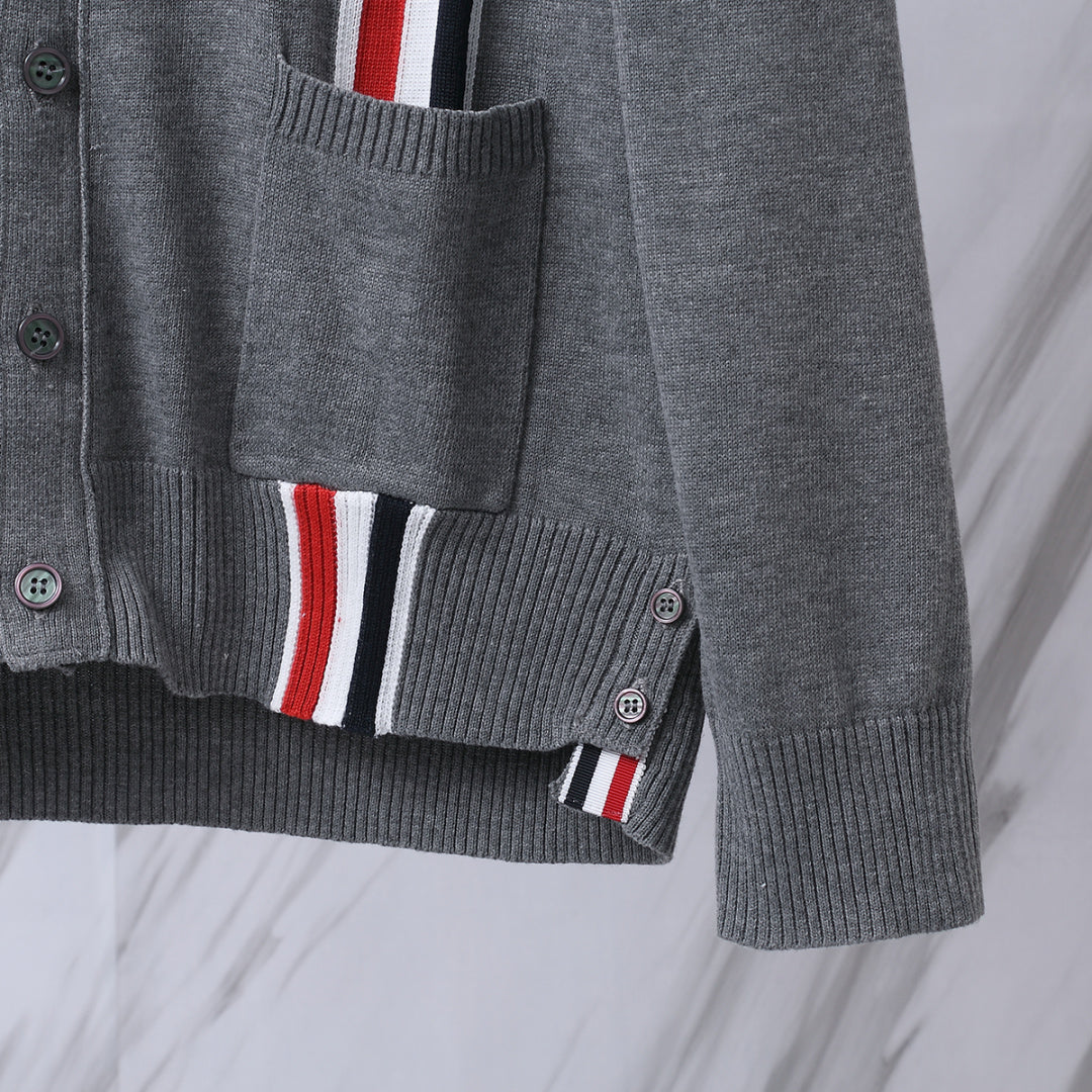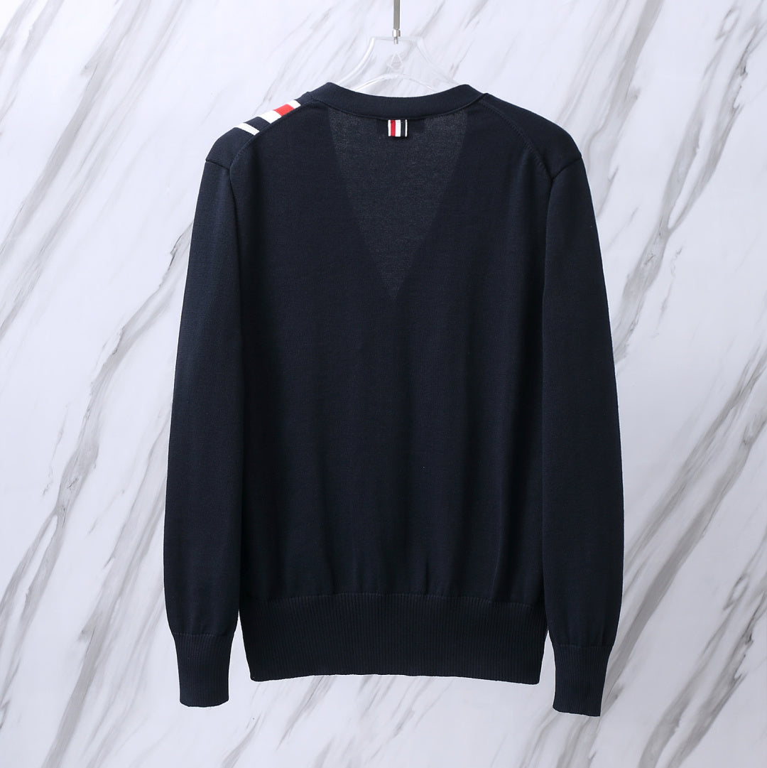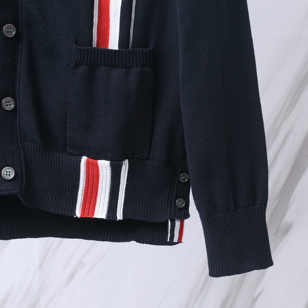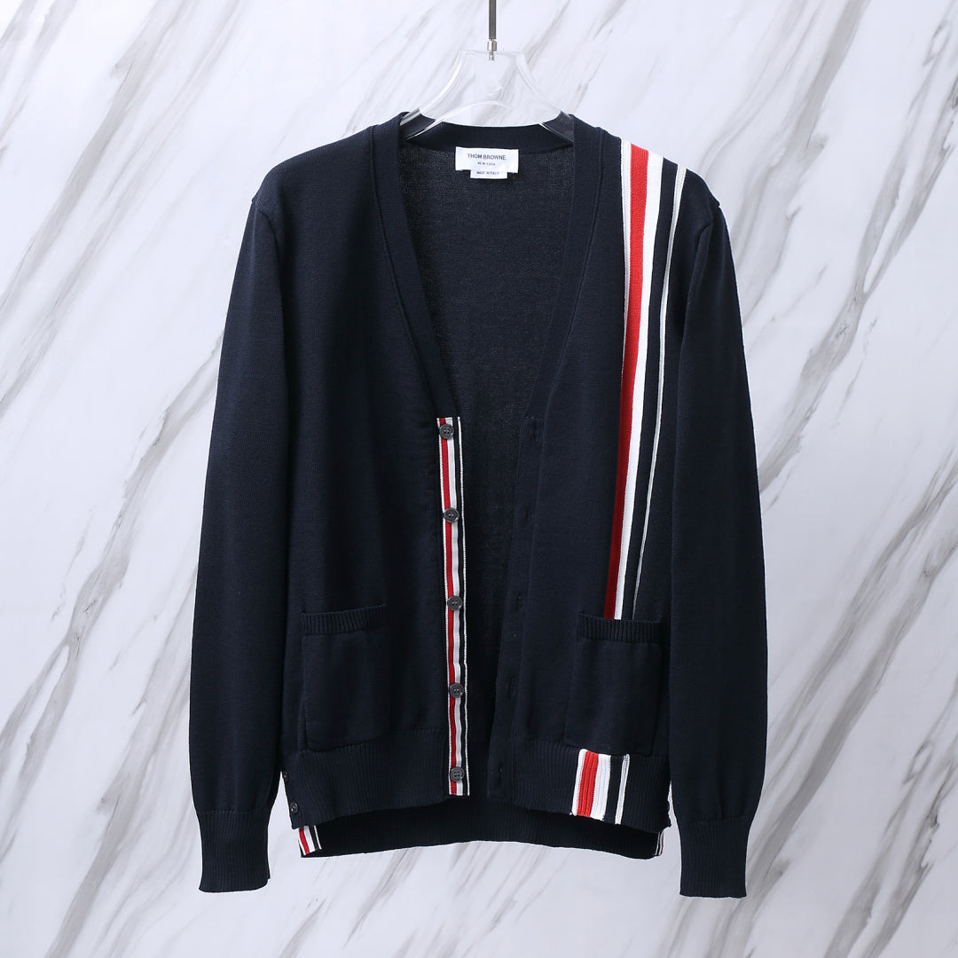 Elevate your wardrobe with the Thom Browne TB M36 V-neck cardigan sweater, a standout piece featuring a classic red, white, and blue design. Crafted from a premium wool blend, this full-body cardigan offers a soft and comfortable fit, perfect for year-round wear.