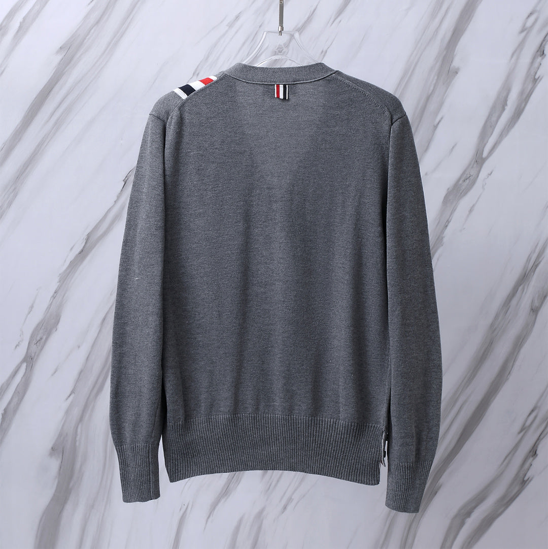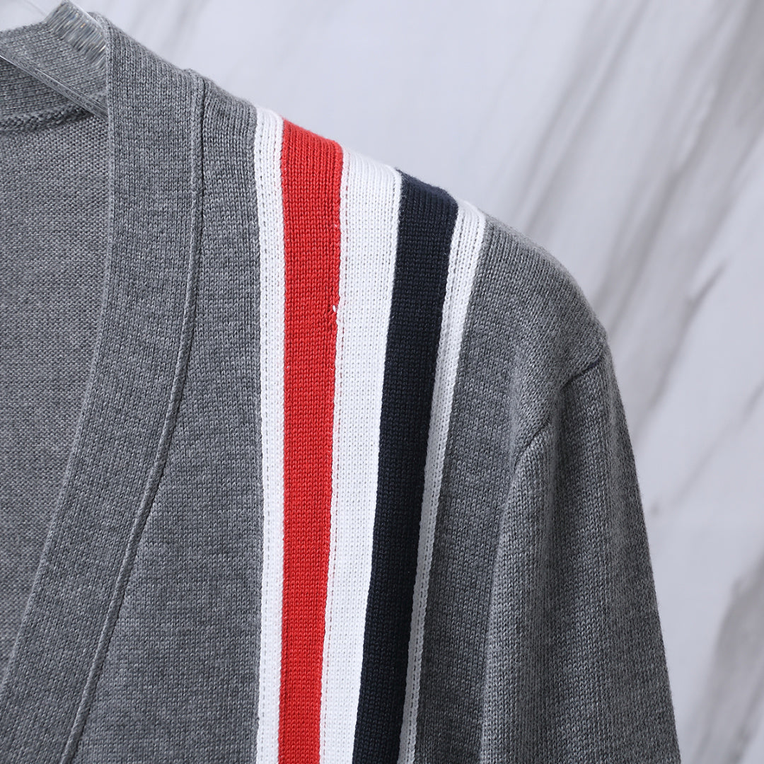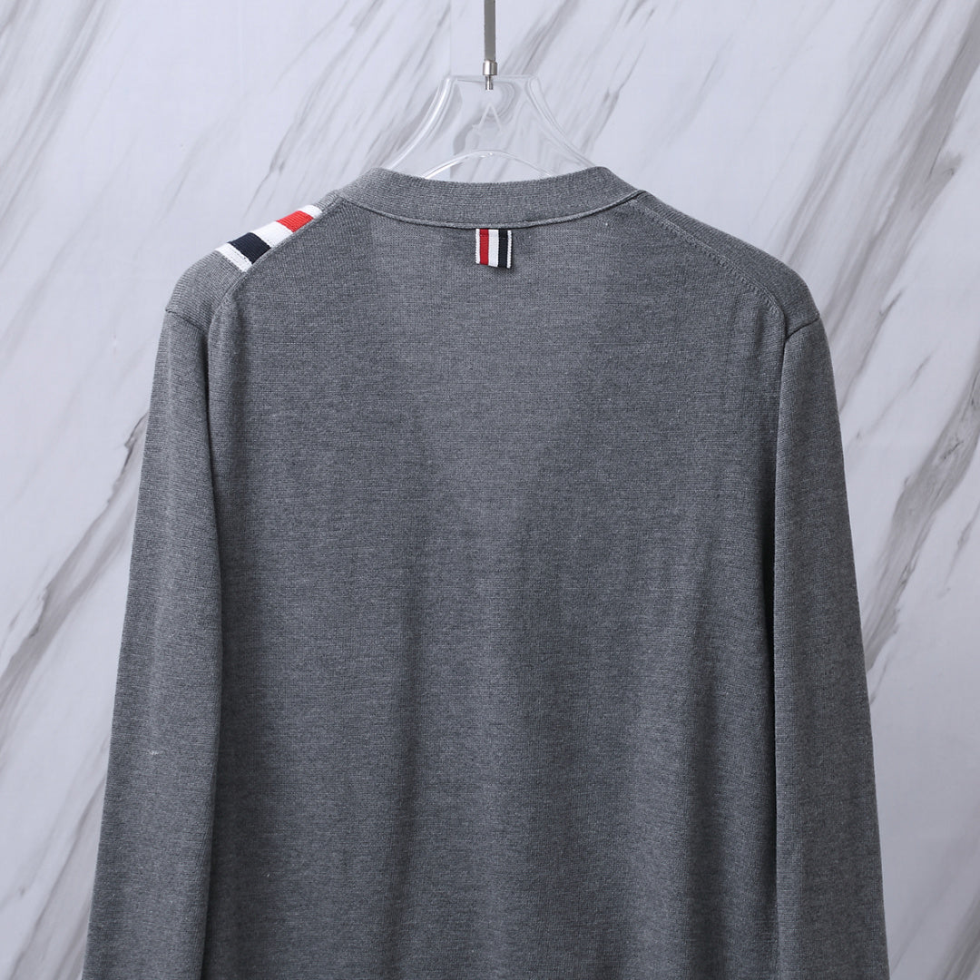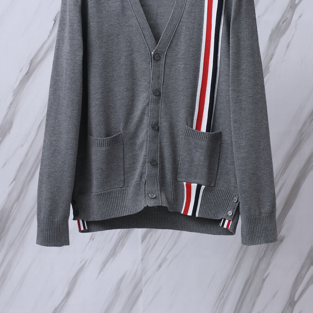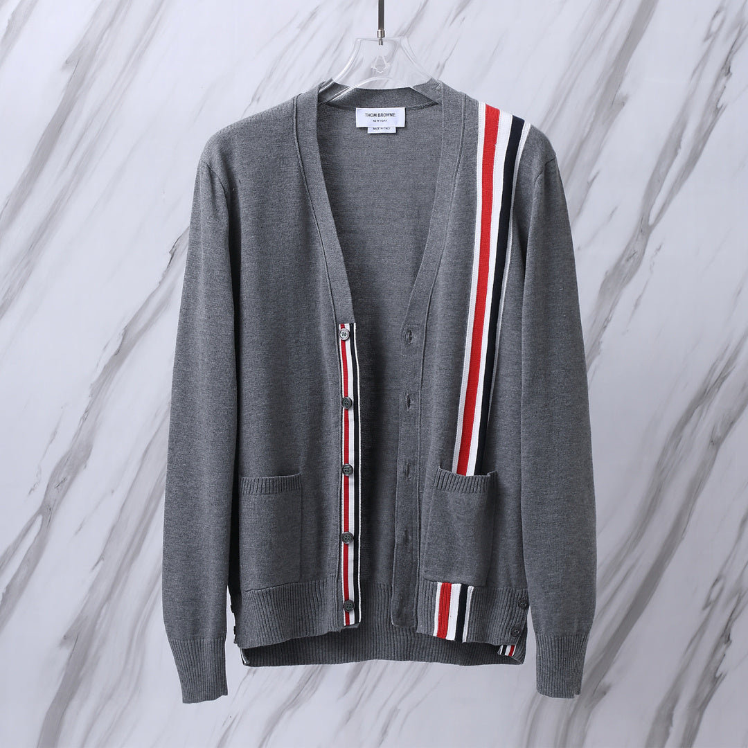 Elevate your wardrobe with the Thom Browne TB M36 V-neck cardigan sweater, a standout piece featuring a classic red, white, and blue design. Crafted from a premium wool blend, this full-body cardigan offers a soft and comfortable fit, perfect for year-round wear.