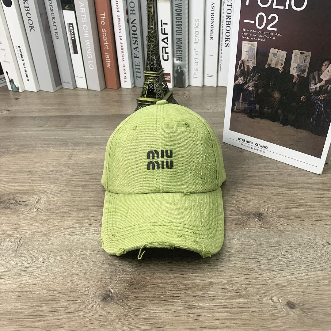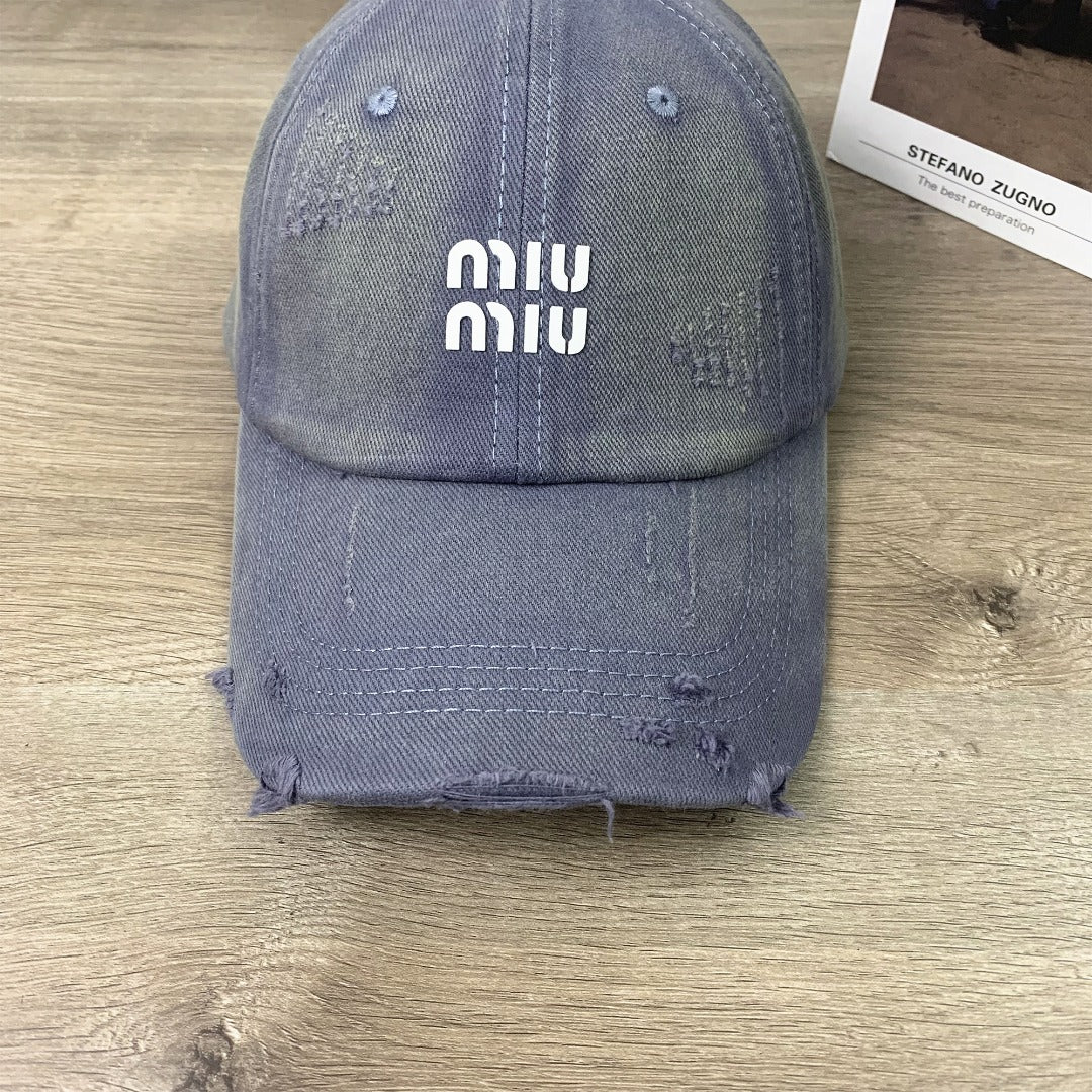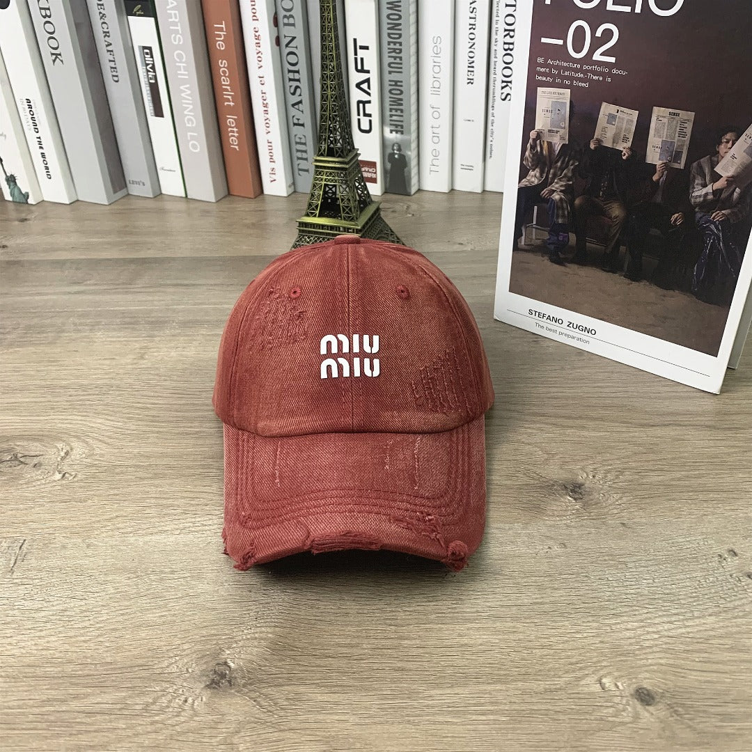Discover the unisex Miu Miu Printed Hole-Worn Baseball Cap, designed for both men and women who appreciate style and versatility. This small peaked cap features a unique printed design and a distressed finish, making it the perfect accessory for any casual outfit. The adjustable strap ensures a comfortable fit for everyone, while the selection of colors—khaki, black, green, burgundy, purple, and gray—allows you to express your personal style. Elevate your wardrobe with this fashion-forward cap today!