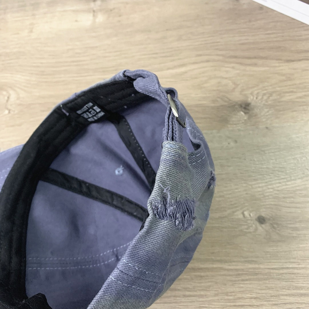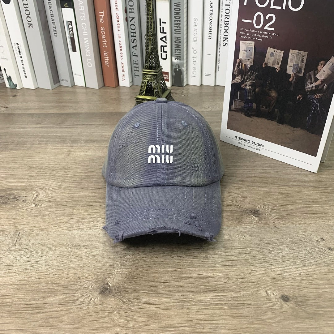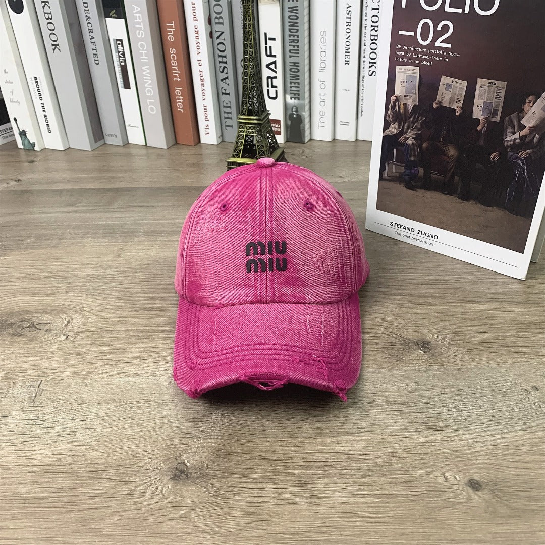 Discover the unisex Miu Miu Printed Hole-Worn Baseball Cap, designed for both men and women who appreciate style and versatility. This small peaked cap features a unique printed design and a distressed finish, making it the perfect accessory for any casual outfit. The adjustable strap ensures a comfortable fit for everyone, while the selection of colors—khaki, black, green, burgundy, purple, and gray—allows you to express your personal style. Elevate your wardrobe with this fashion-forward cap today!