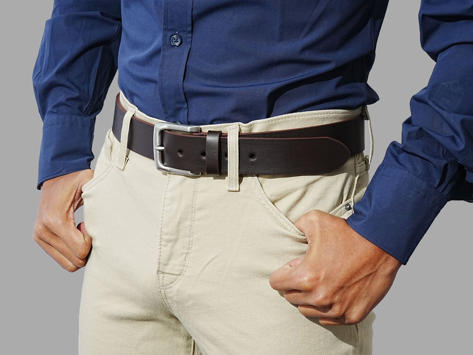 The solid construction ensures it keeps going for years with no cardboard or synthetic fillers. Just leather. Whether paired with jeans, chinos, dress pants, or shorts, it fits seamlessly with men's leather boots or Oxford shoes, tying everything together with ease.