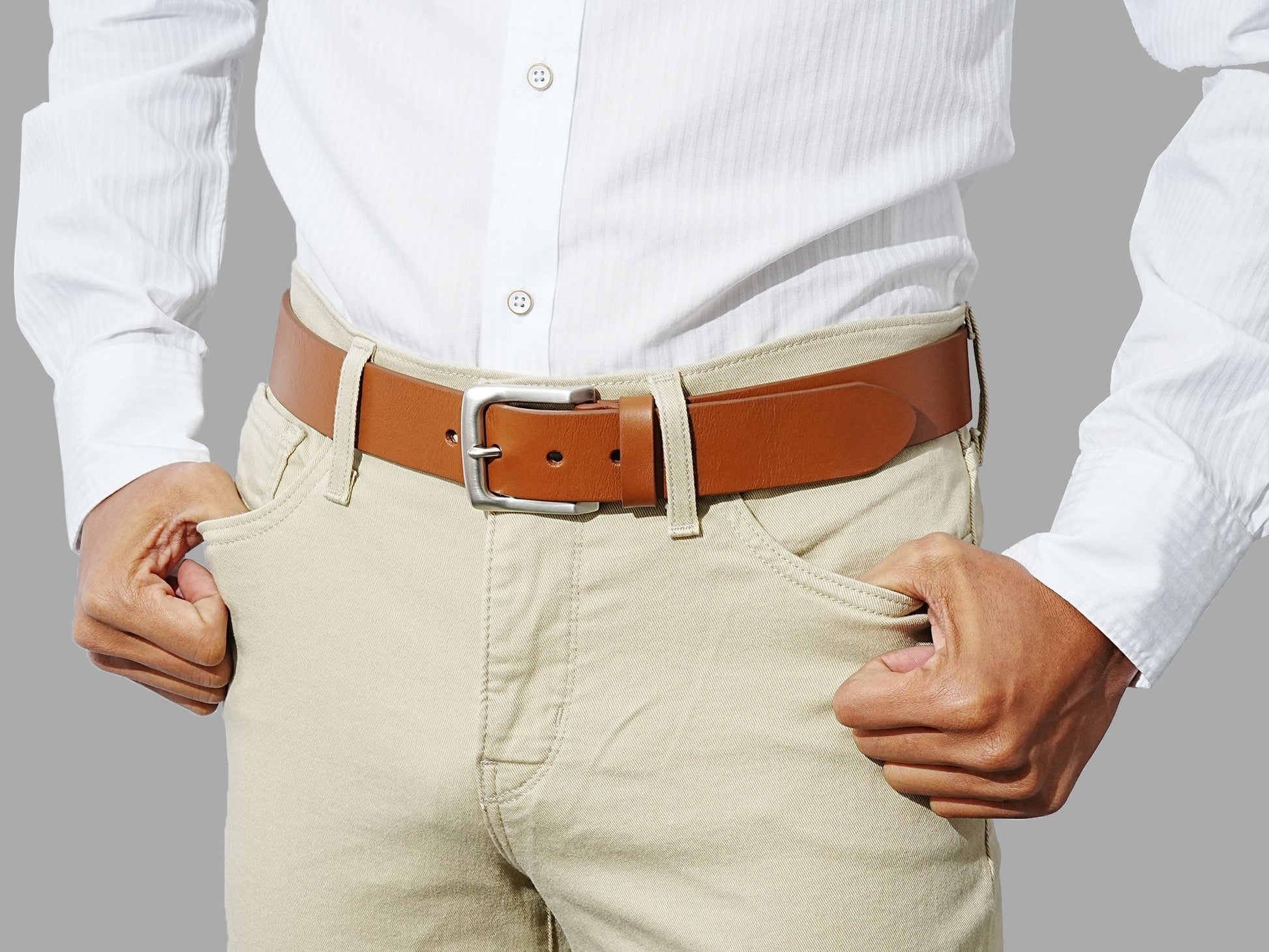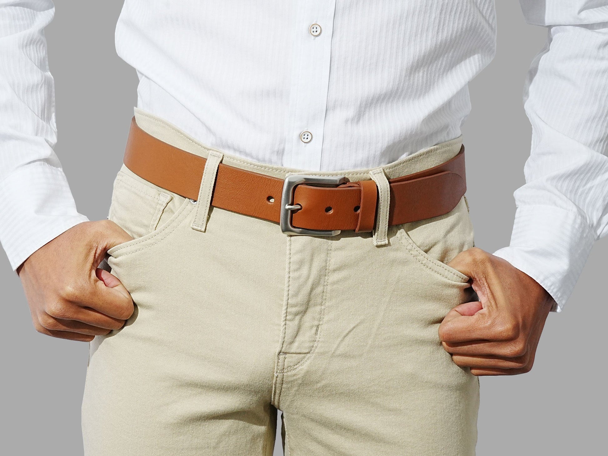 This belt beautifully holds all your pieces together. Its solid construction ensures it keeps going for many years, with no cardboard or synthetic fillers. It's suitable for jeans, chinos, dress pants, and shorts, pairing nicely with your men's leather boots and oxford shoes.