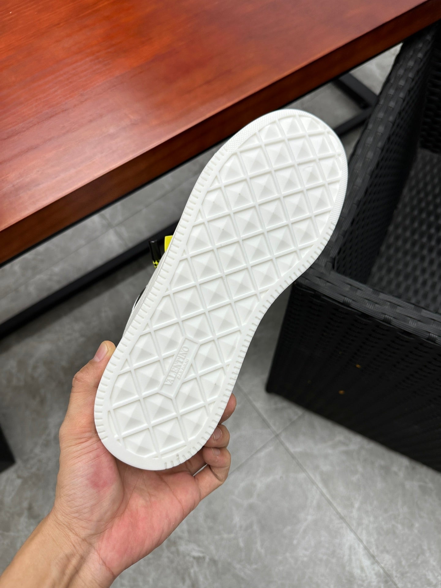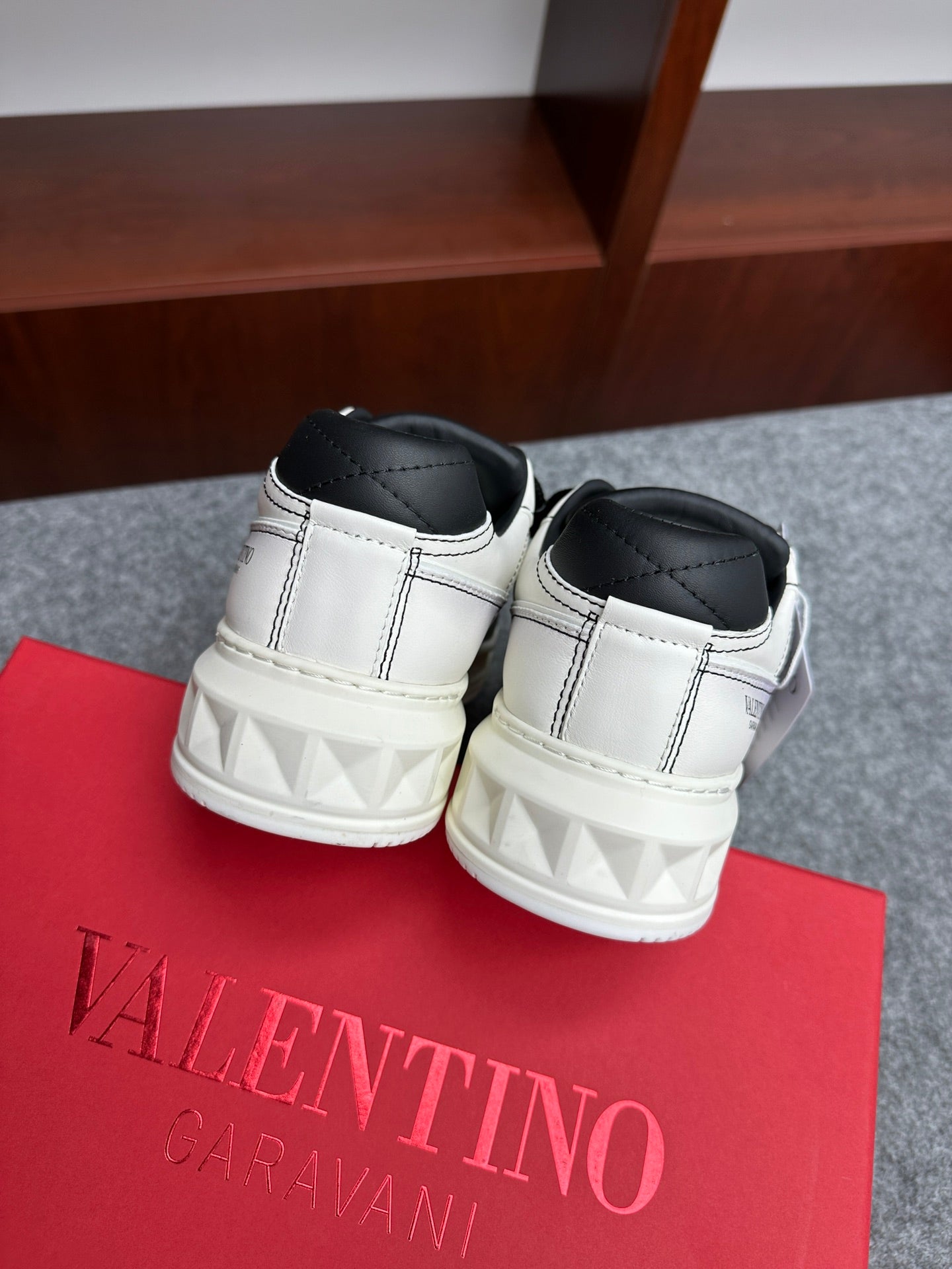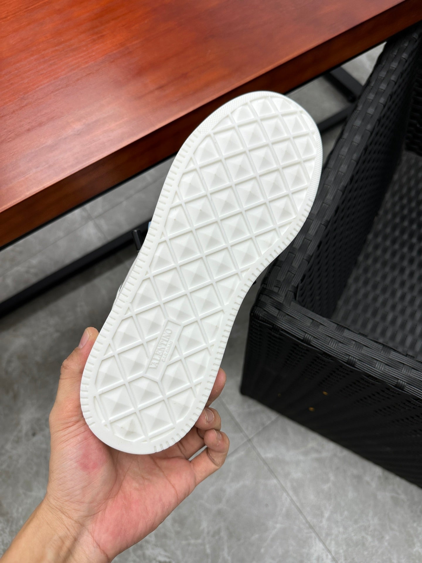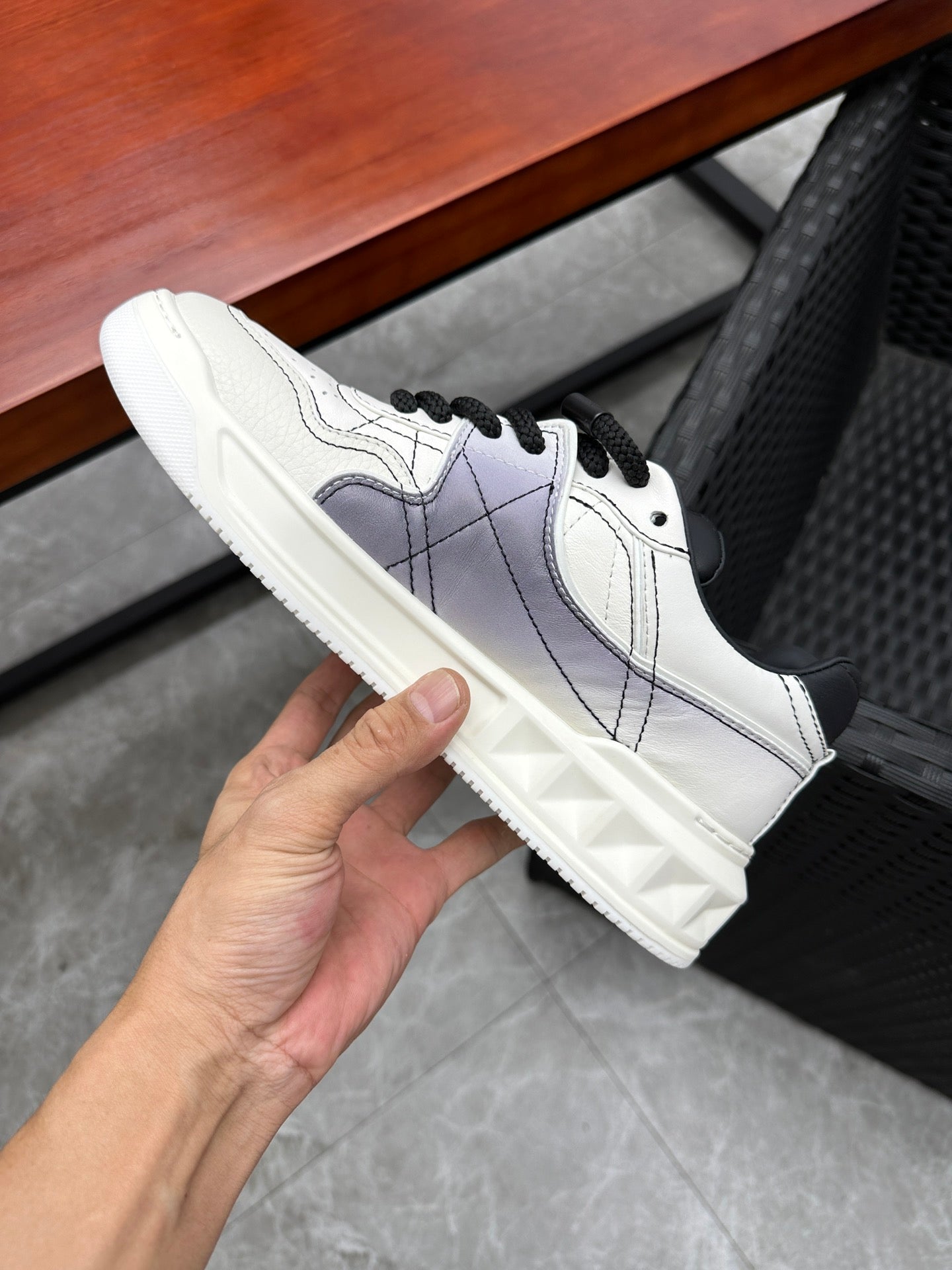 Elevate your footwear collection with the Valentino Garavani ONE STUD low-top calfskin sneakers. Featuring a sleek semi-matte finish, these sneakers boast oversized rivet details that make a bold statement. The heel and tongue are adorned with the iconic Valentino Garavani screen-printed logo, adding a touch of luxury. Designed for comfort and style, the rubber sole is also enhanced with bas-relief oversized rivet details. Available in sizes 38-44, with custom options for size 45. Step out in style with these chic and contemporary sneakers.