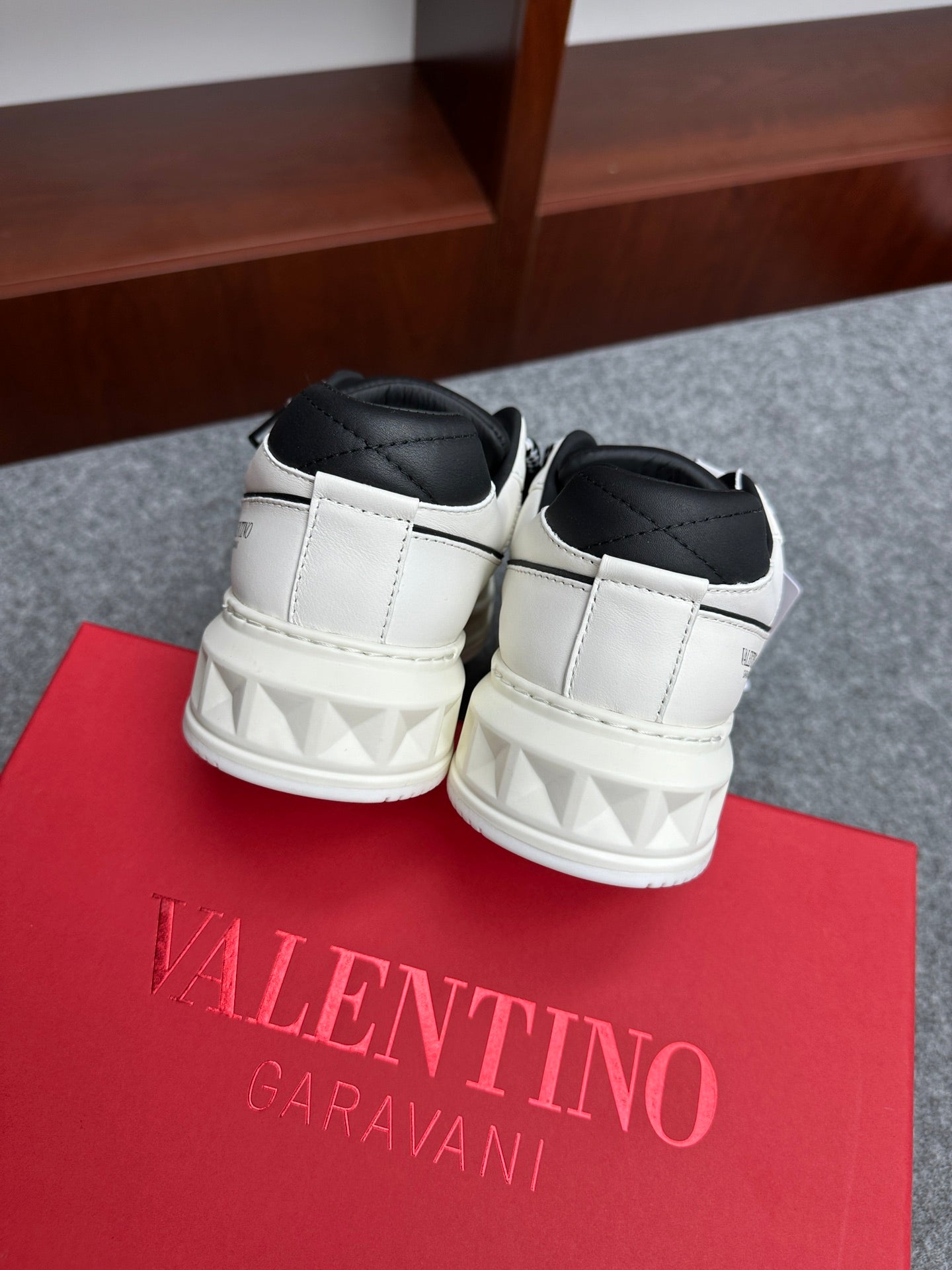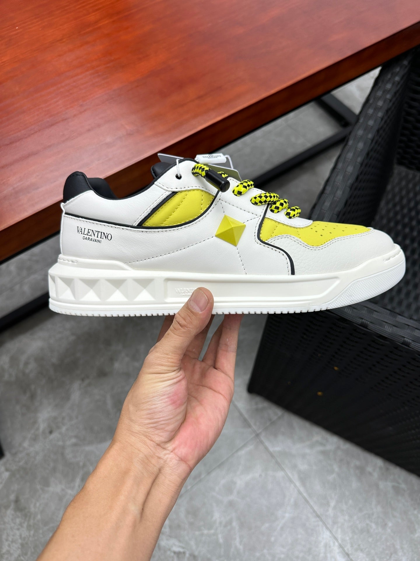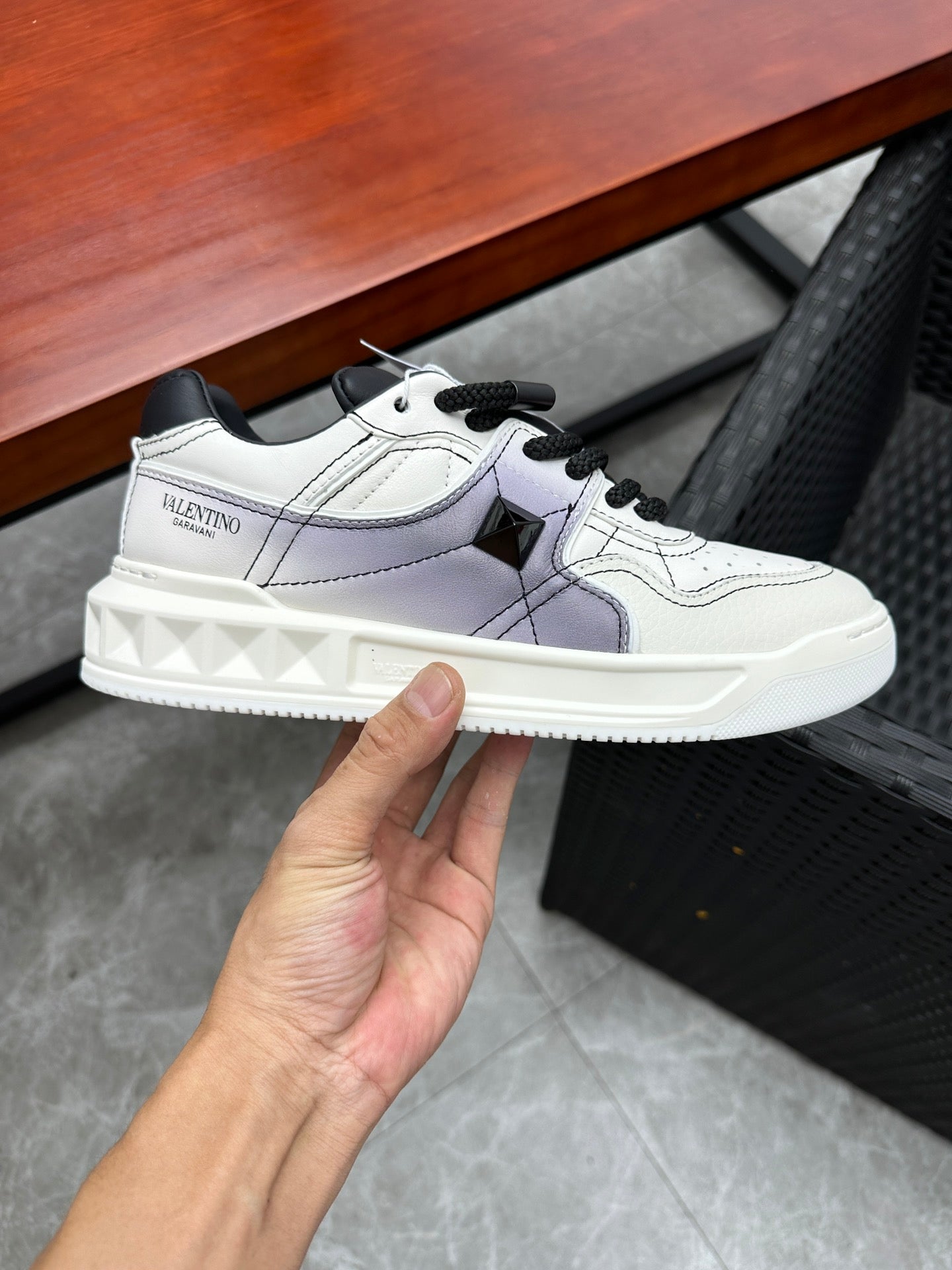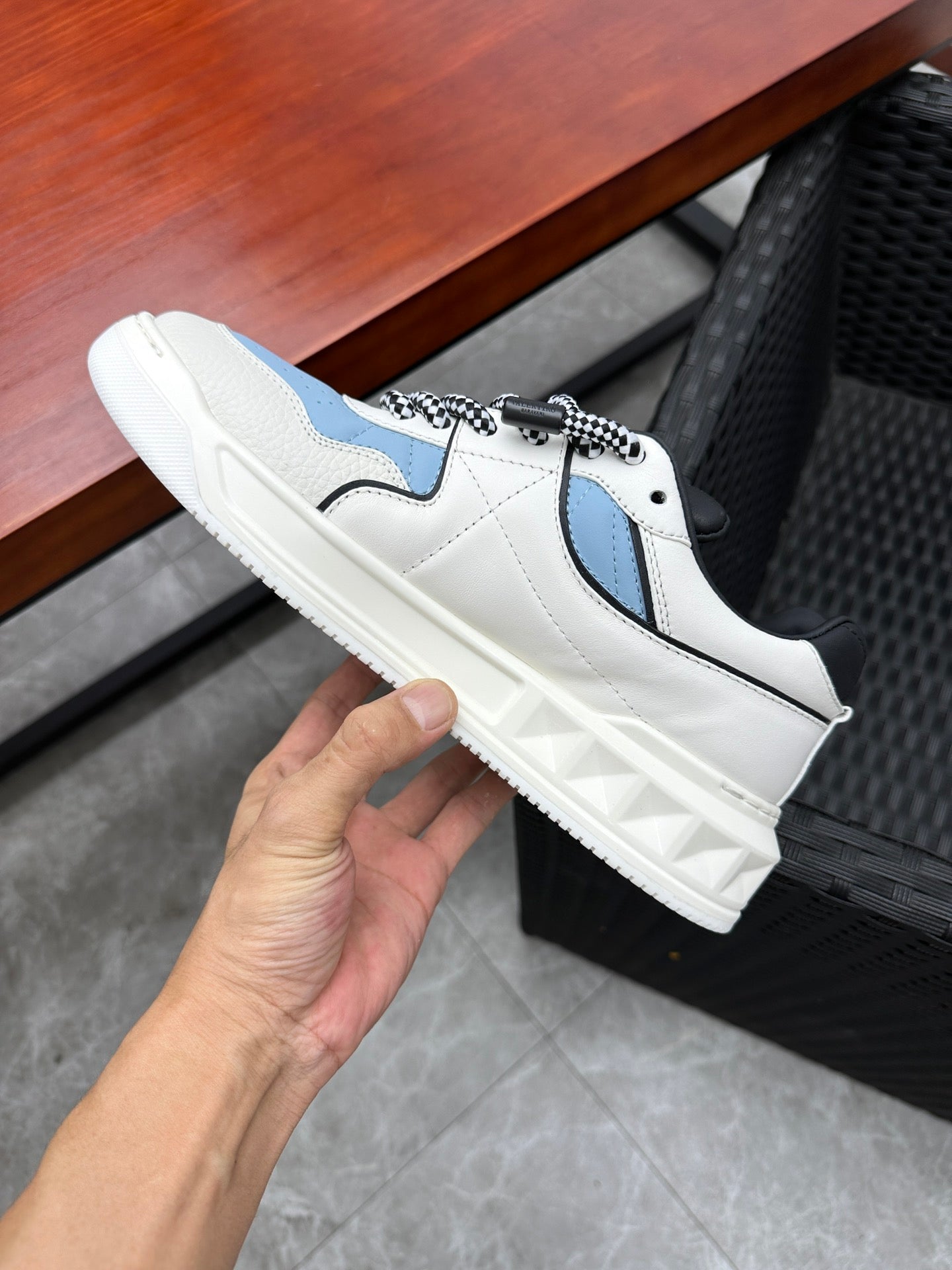 Elevate your footwear collection with the Valentino Garavani ONE STUD low-top calfskin sneakers. Featuring a sleek semi-matte finish, these sneakers boast oversized rivet details that make a bold statement. The heel and tongue are adorned with the iconic Valentino Garavani screen-printed logo, adding a touch of luxury. Designed for comfort and style, the rubber sole is also enhanced with bas-relief oversized rivet details. Available in sizes 38-44, with custom options for size 45. Step out in style with these chic and contemporary sneakers.