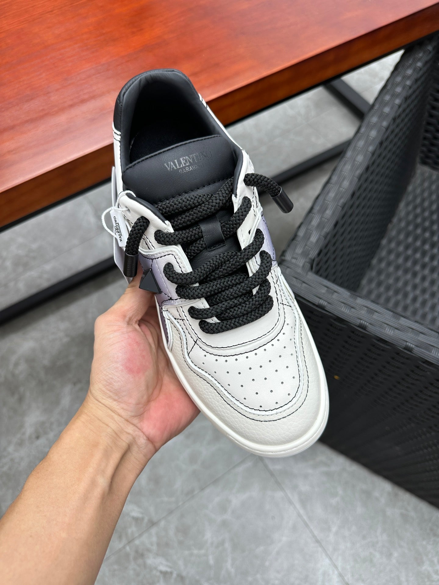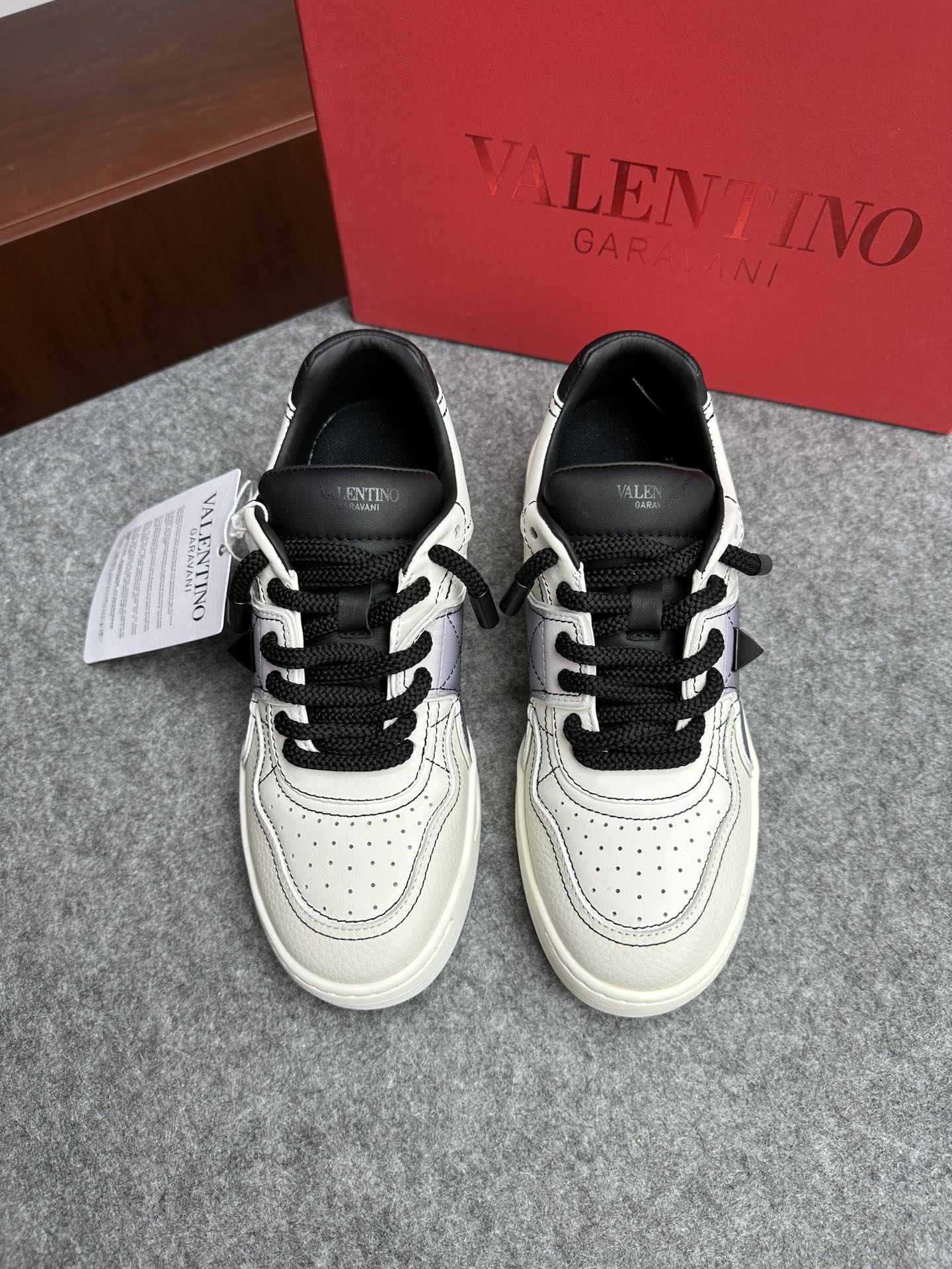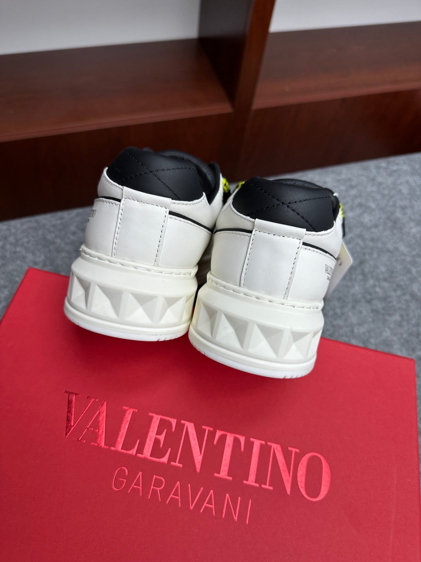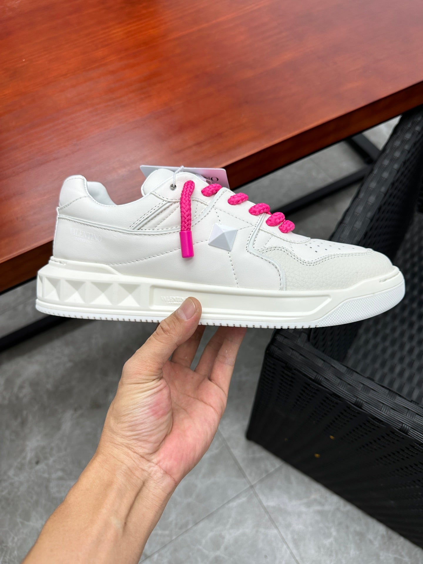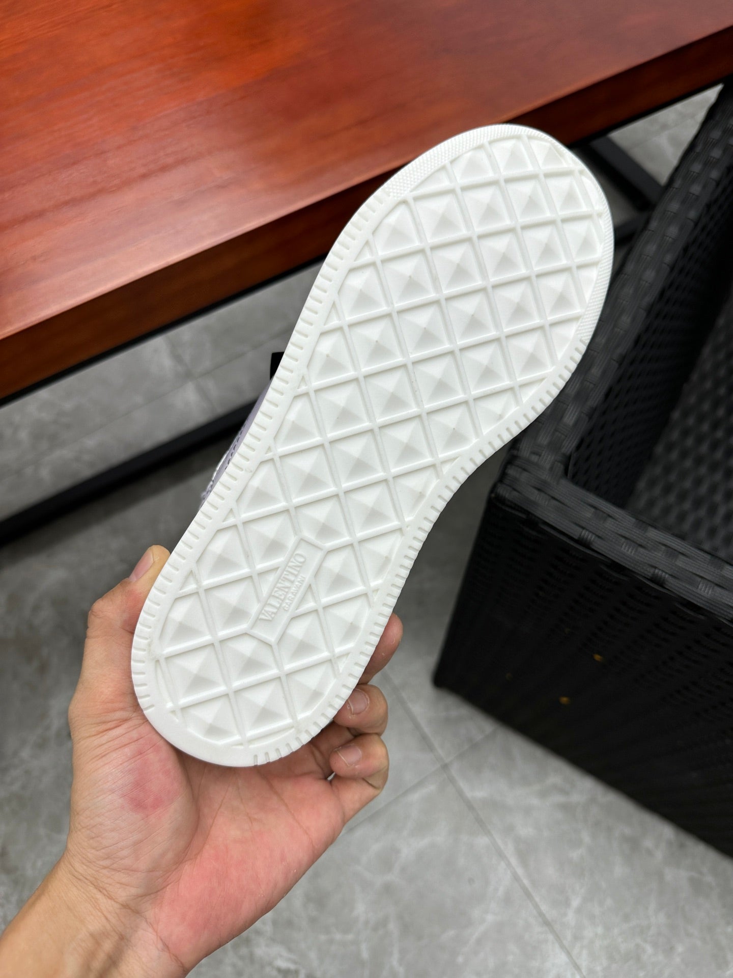 Elevate your footwear collection with the Valentino Garavani ONE STUD low-top calfskin sneakers. Featuring a sleek semi-matte finish, these sneakers boast oversized rivet details that make a bold statement. The heel and tongue are adorned with the iconic Valentino Garavani screen-printed logo, adding a touch of luxury. Designed for comfort and style, the rubber sole is also enhanced with bas-relief oversized rivet details. Available in sizes 38-44, with custom options for size 45. Step out in style with these chic and contemporary sneakers.