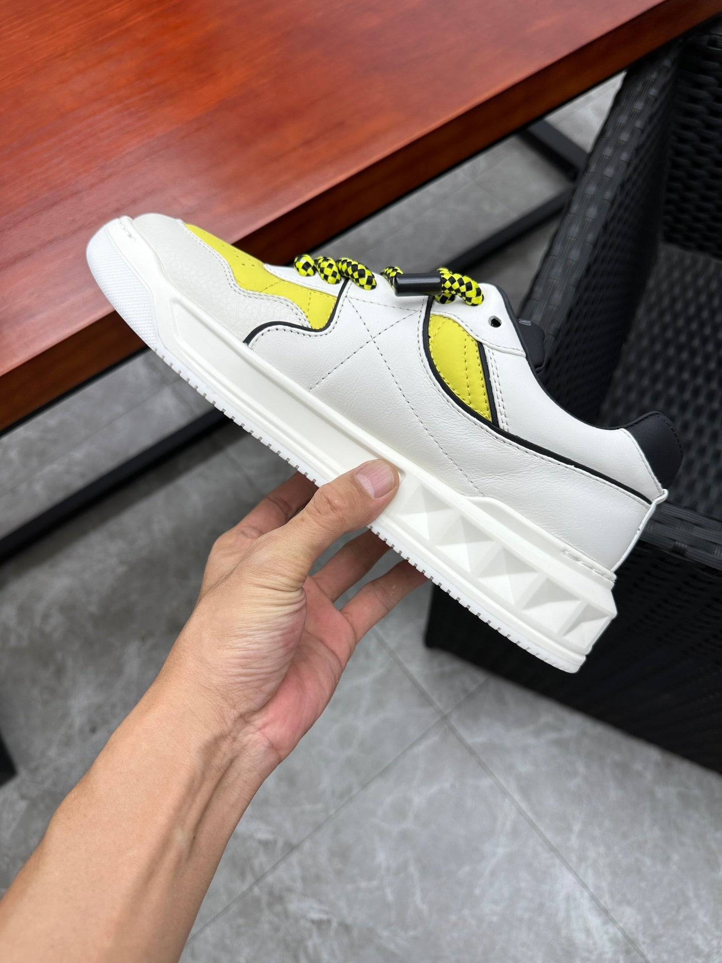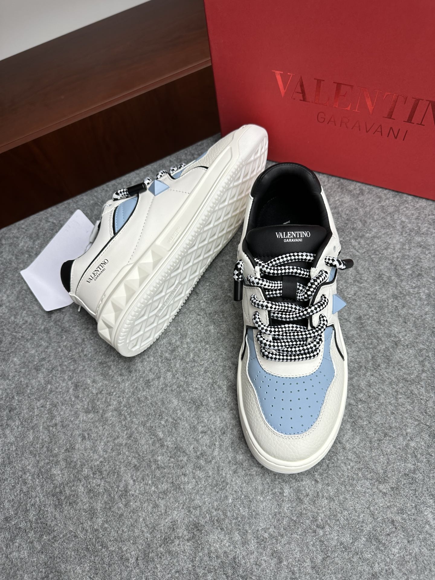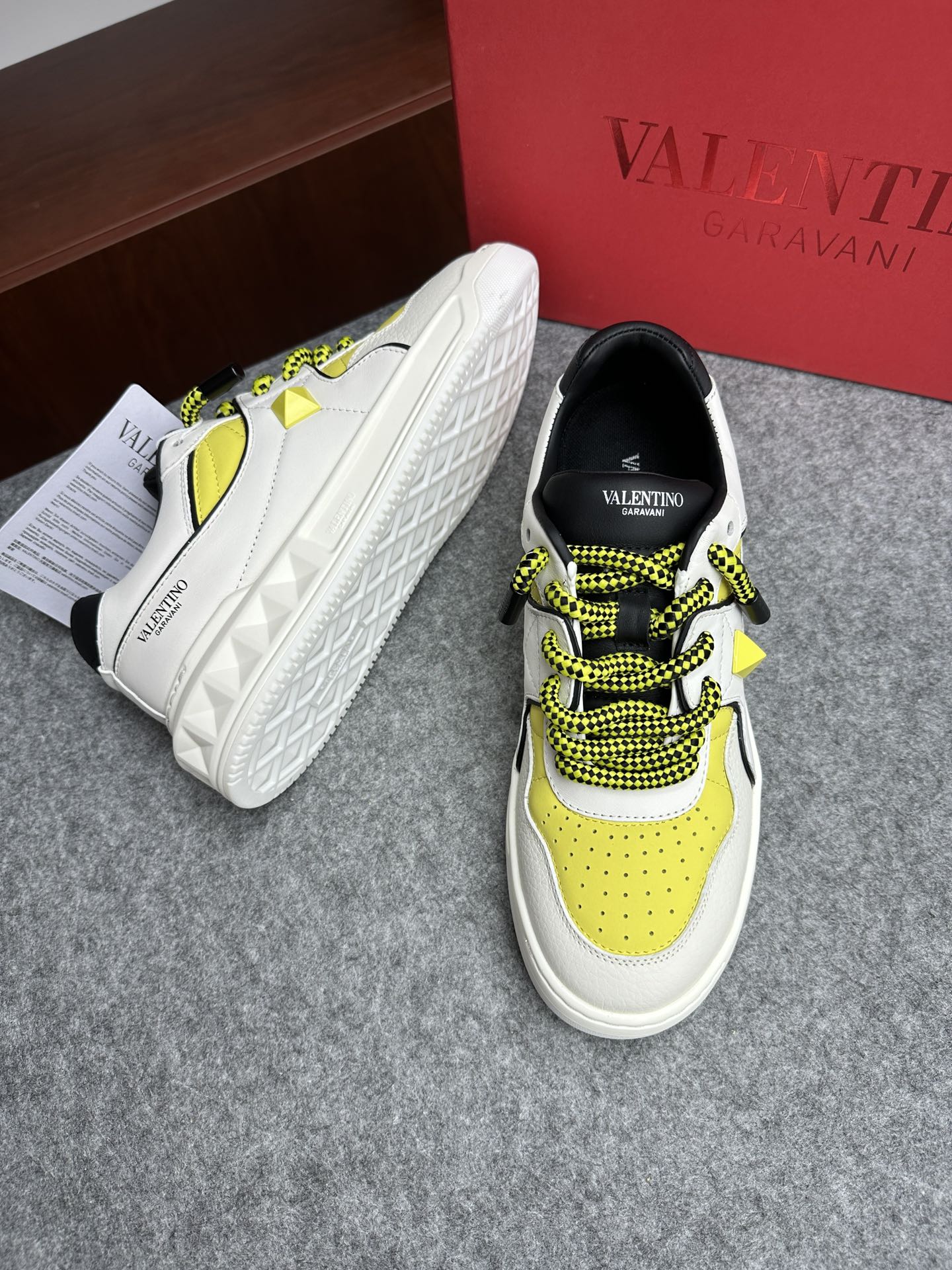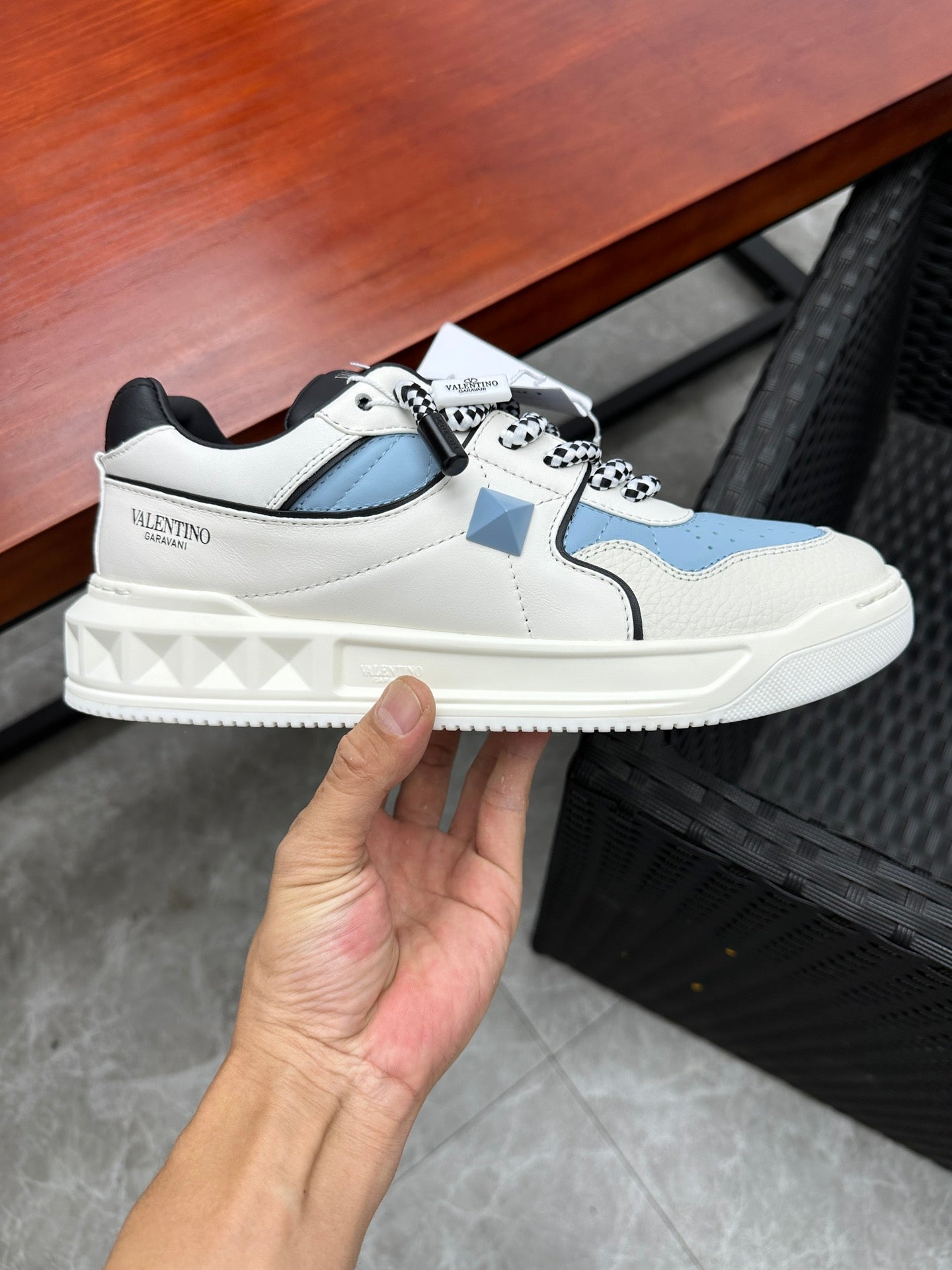 Elevate your footwear collection with the Valentino Garavani ONE STUD low-top calfskin sneakers. Featuring a sleek semi-matte finish, these sneakers boast oversized rivet details that make a bold statement. The heel and tongue are adorned with the iconic Valentino Garavani screen-printed logo, adding a touch of luxury. Designed for comfort and style, the rubber sole is also enhanced with bas-relief oversized rivet details. Available in sizes 38-44, with custom options for size 45. Step out in style with these chic and contemporary sneakers.