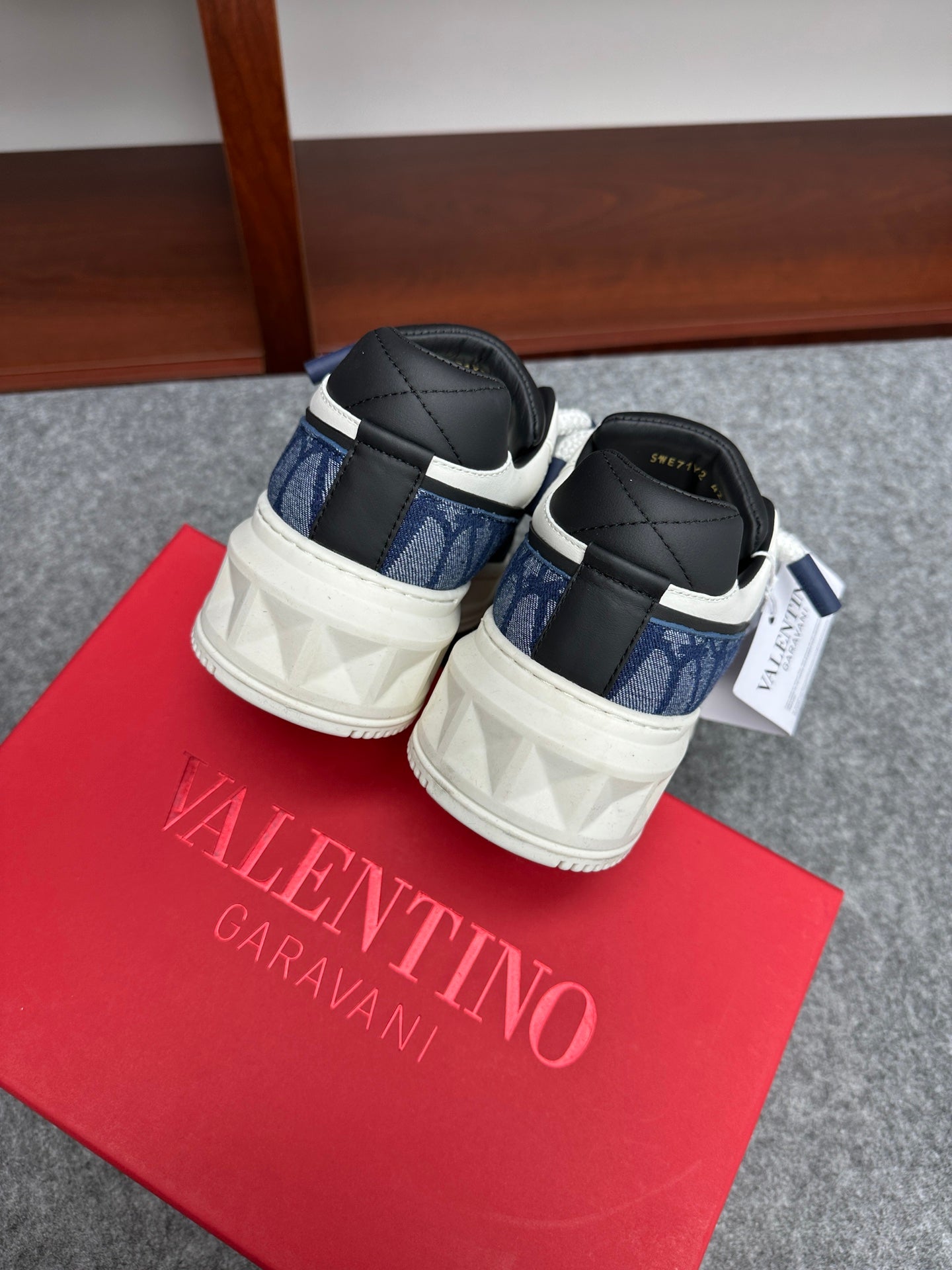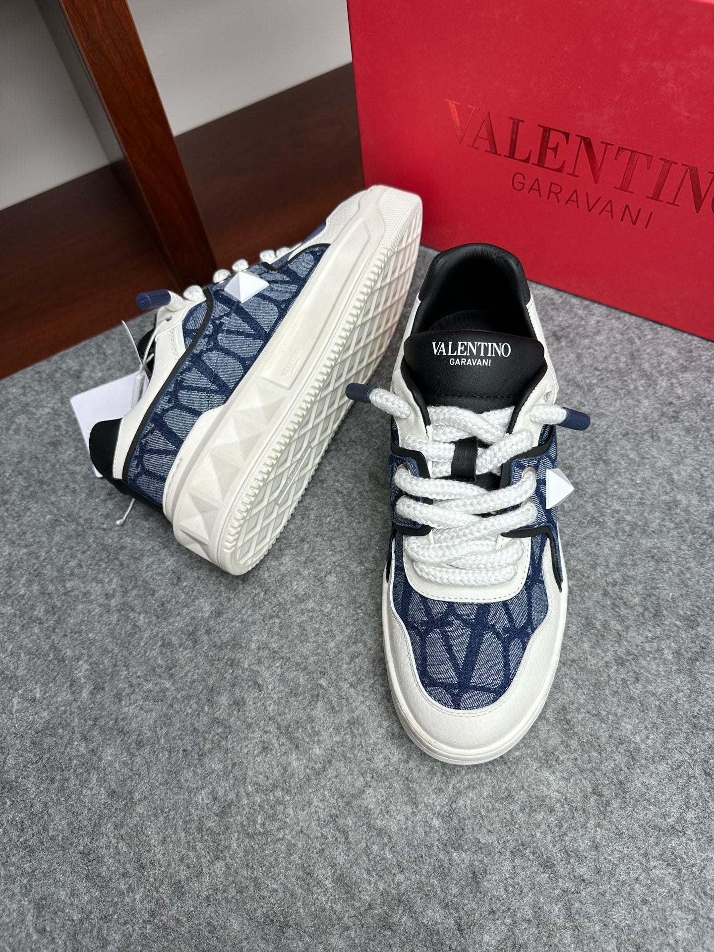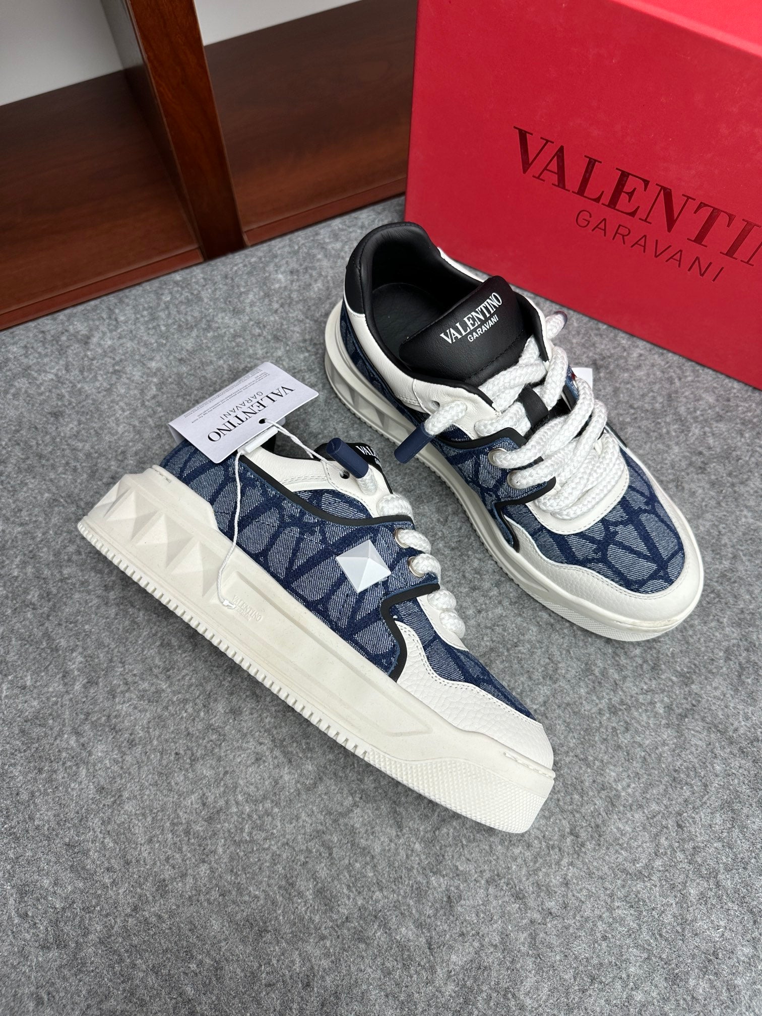 Elevate your sneaker game with the Valentino Garavani ONE STUD low-top sneakers. Crafted from premium calfskin and branded jacquard fabric, these shoes feature a semi-matte finish and striking oversized rivet details for a bold look. The heel and tongue are adorned with the iconic Valentino Garavani logo for a touch of elegance. Designed with a durable rubber sole, these sneakers combine style and comfort seamlessly. Available in size 38-44, with a custom option for size 45. Step out in luxury with Valentino Garavani.
