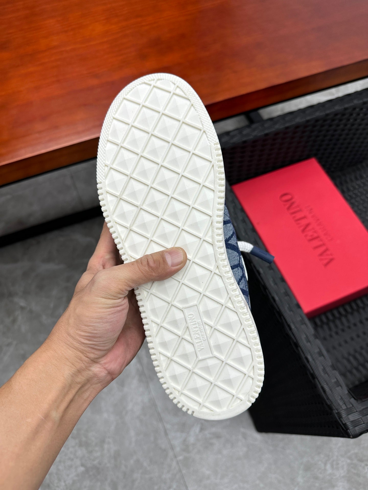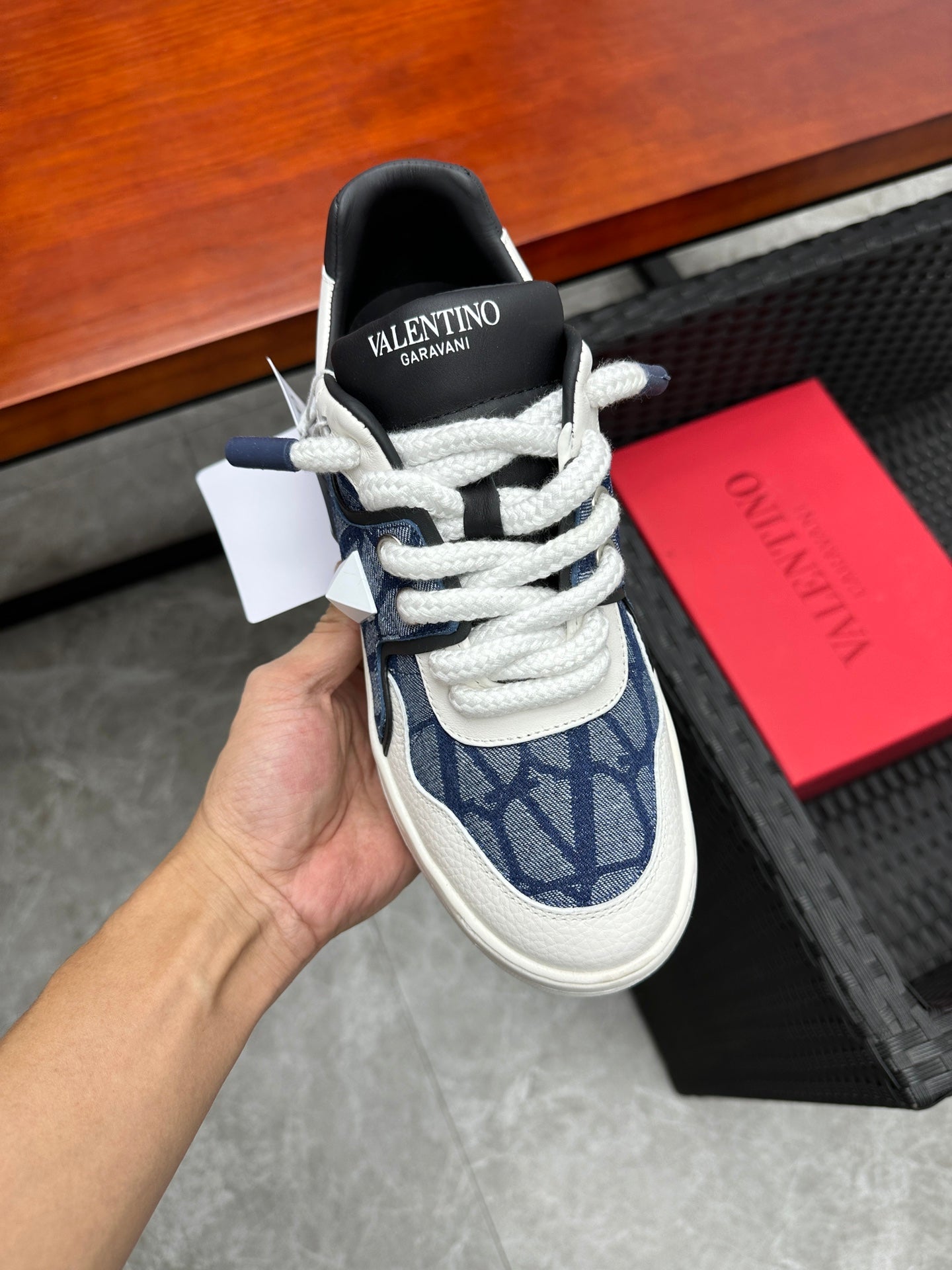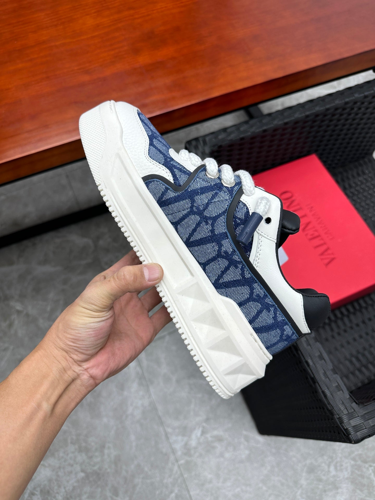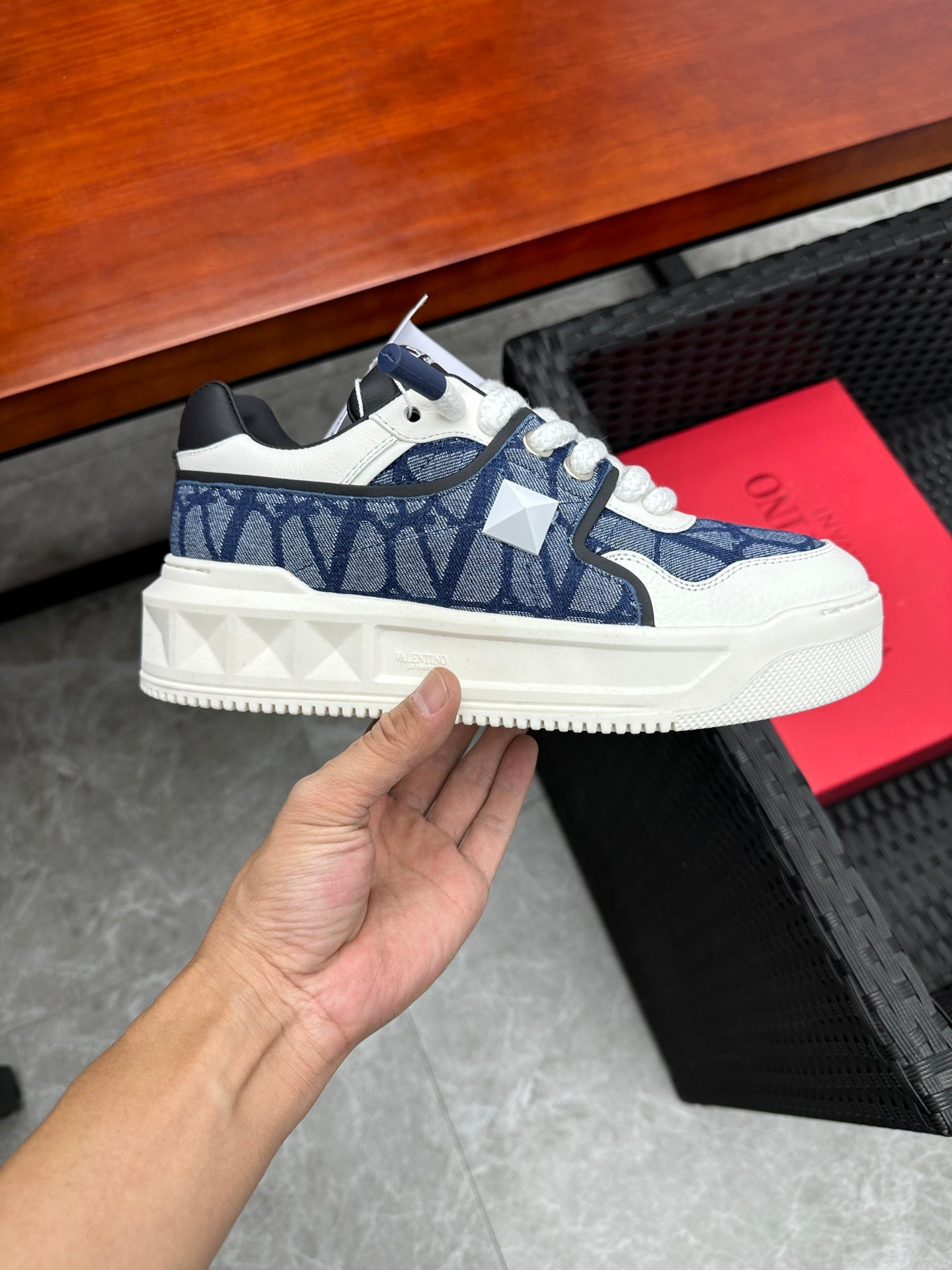 Elevate your sneaker game with the Valentino Garavani ONE STUD low-top sneakers. Crafted from premium calfskin and branded jacquard fabric, these shoes feature a semi-matte finish and striking oversized rivet details for a bold look. The heel and tongue are adorned with the iconic Valentino Garavani logo for a touch of elegance. Designed with a durable rubber sole, these sneakers combine style and comfort seamlessly. Available in size 38-44, with a custom option for size 45. Step out in luxury with Valentino Garavani.