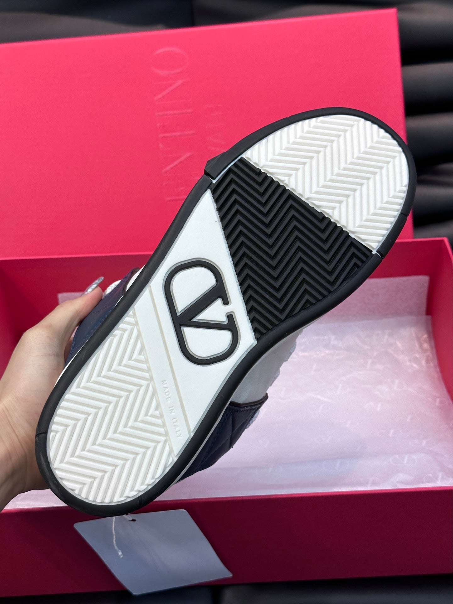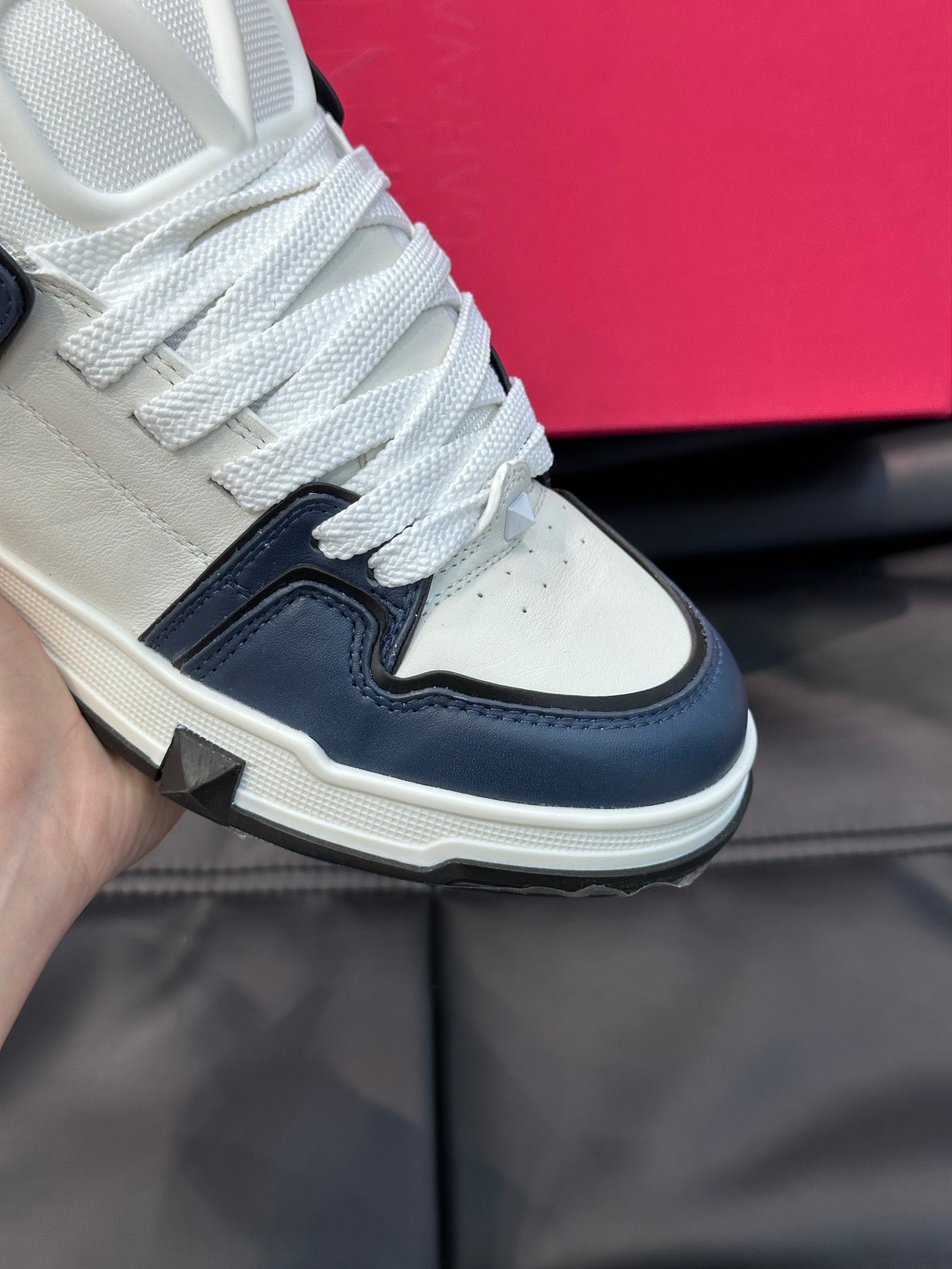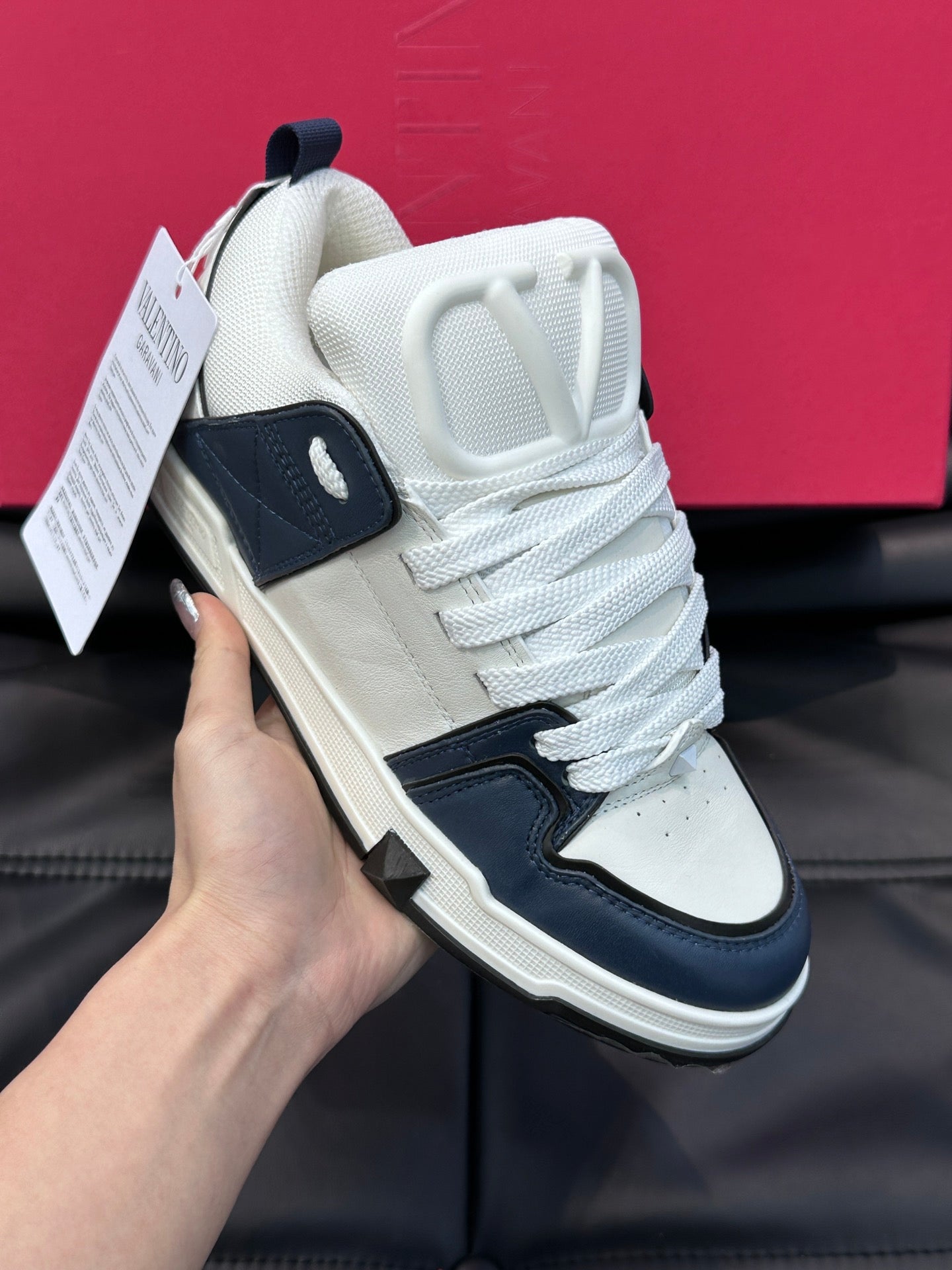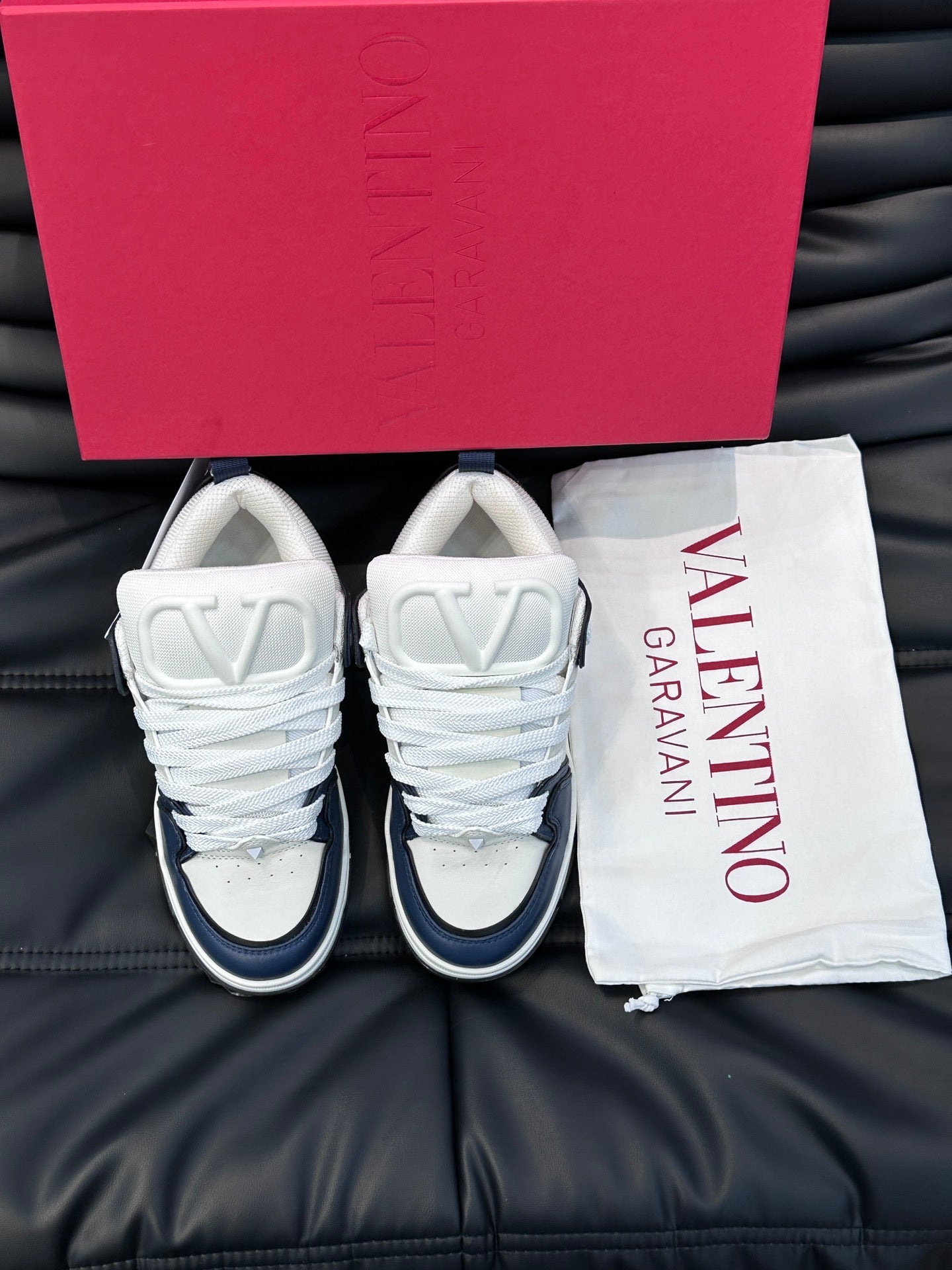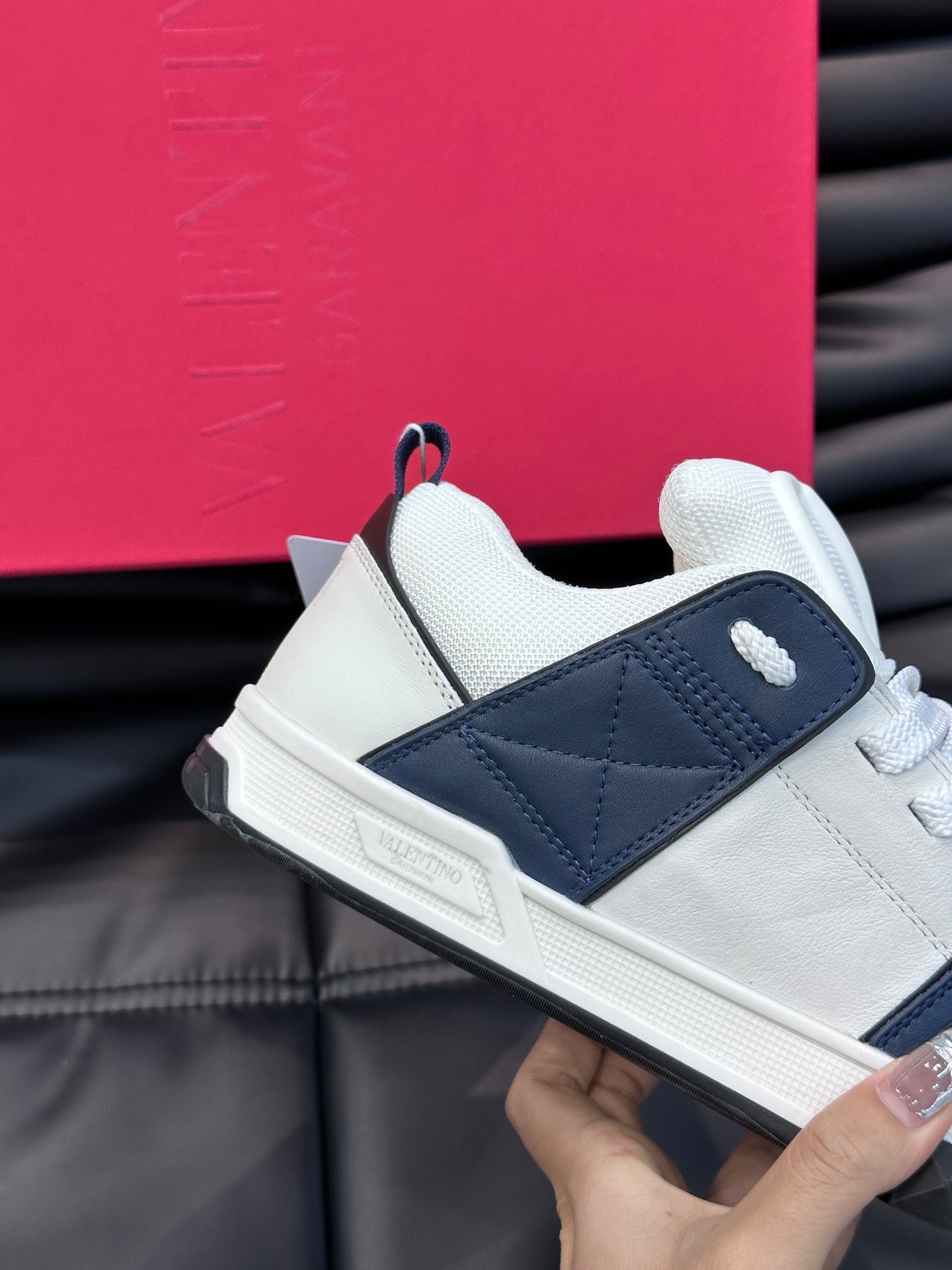 Discover the bold style of the Valentino Oversized Vlogo Tongue Skate Shoes. Featuring an eye-catching oversized Vlogo tongue and a striking contrasting color upper, these shoes make a statement. The design is enhanced by oversized rivets on the side of the rubber sole, showcasing the Vlogo signature pattern. Made from durable heavy-duty leather, every detail is crafted for both aesthetics and longevity. Available in sizes 38-45, these high-quality shoes from Dongguan are perfect for those looking to elevate their footwear collection.