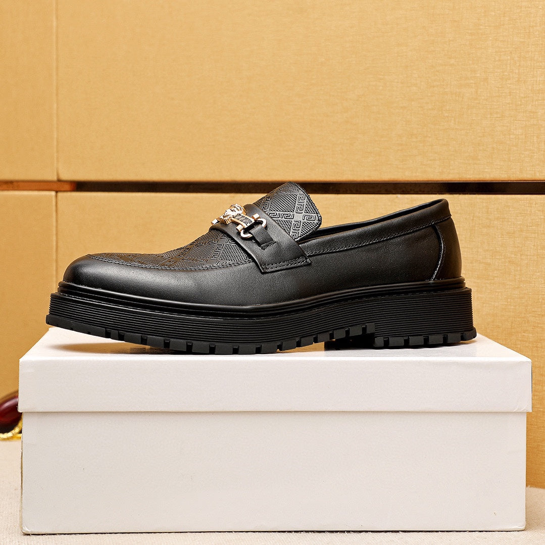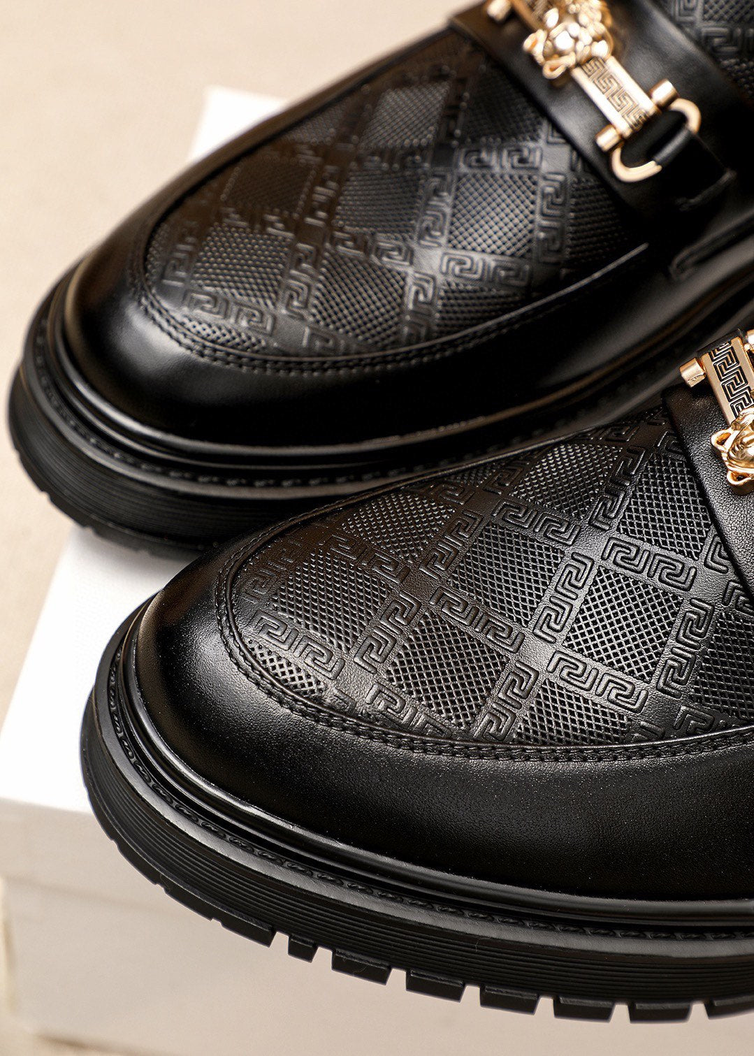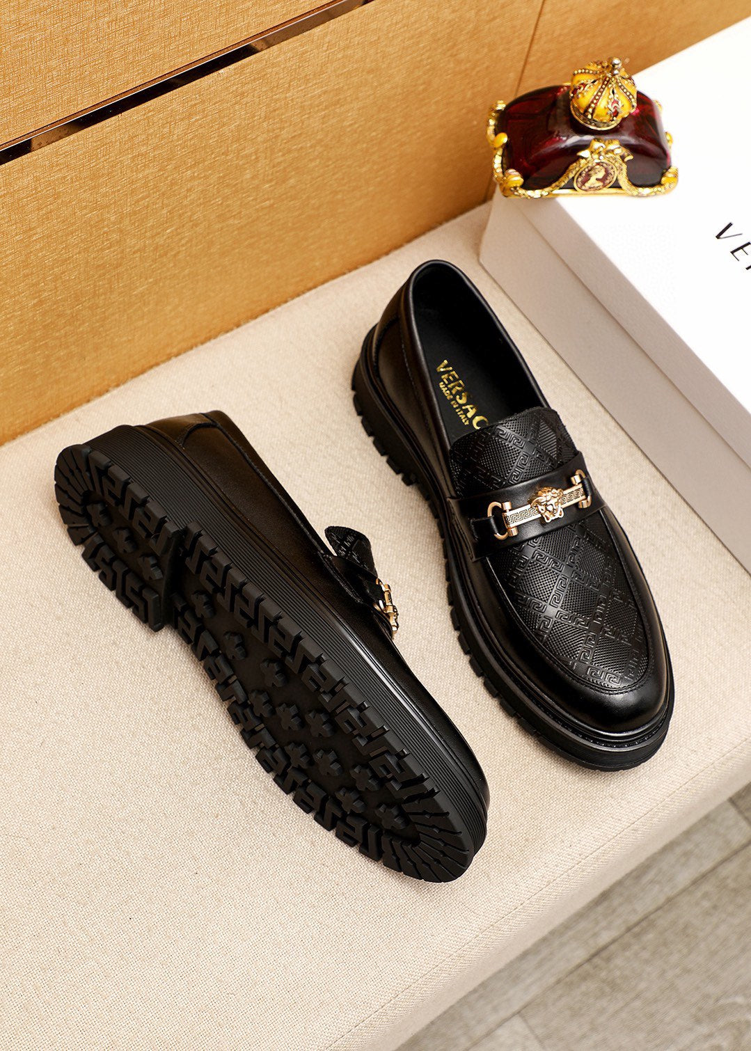Step out in style with the VERSACE "Versace" Casual Leather Shoes. Crafted from premium first-layer calfskin embossed upper, these shoes combine luxury and comfort effortlessly. The exquisite luxury hardware buckle and imported water-dyed cowhide leather lining provide a sophisticated touch, while the rubber outsole ensures durability and superior traction. Available in sizes 38 to 44, with customizations available up to size 46. Choose from a range of elegant colors to complete your look. Elevate your footwear collection with these timeless leather shoes.