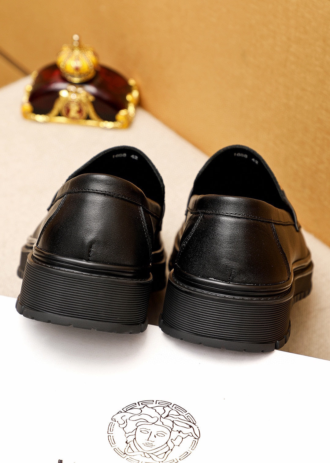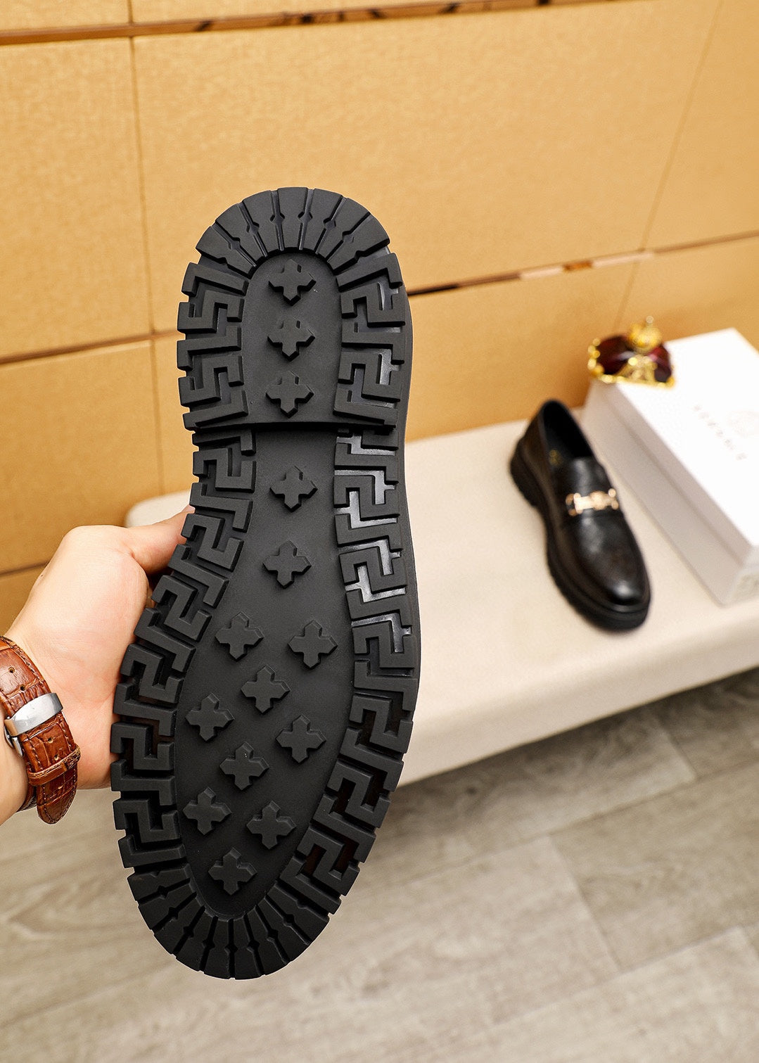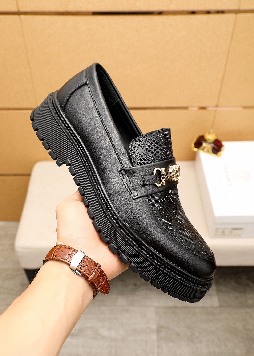 Step out in style with the VERSACE "Versace" Casual Leather Shoes. Crafted from premium first-layer calfskin embossed upper, these shoes combine luxury and comfort effortlessly. The exquisite luxury hardware buckle and imported water-dyed cowhide leather lining provide a sophisticated touch, while the rubber outsole ensures durability and superior traction. Available in sizes 38 to 44, with customizations available up to size 46. Choose from a range of elegant colors to complete your look. Elevate your footwear collection with these timeless leather shoes.