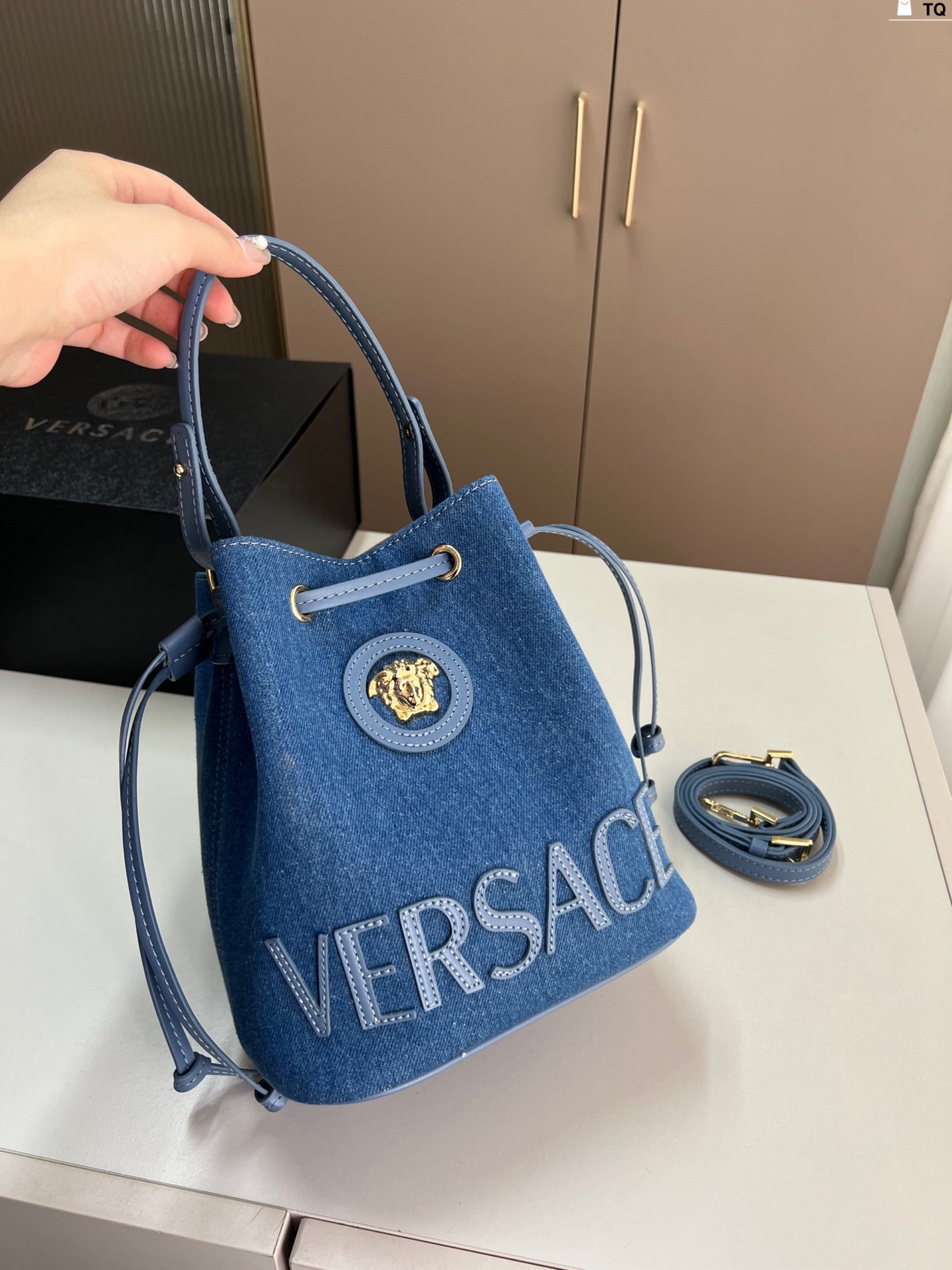 Elevate your style with the Versace Luxury Bucket Bag, a perfect blend of sophistication and functionality. Crafted from premium materials, this designer handbag features the iconic Versace logo and an elegant silhouette that complements any outfit. The spacious interior is designed to hold your essentials while maintaining a chic look. Ideal for both day and evening outings, this bucket bag is a must-have accessory for the modern fashionista. Make a statement with the unmatched quality and timeless design of Versace.