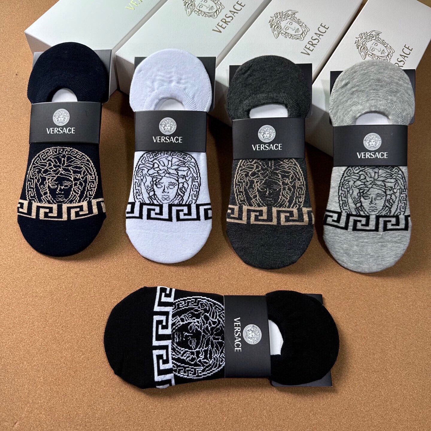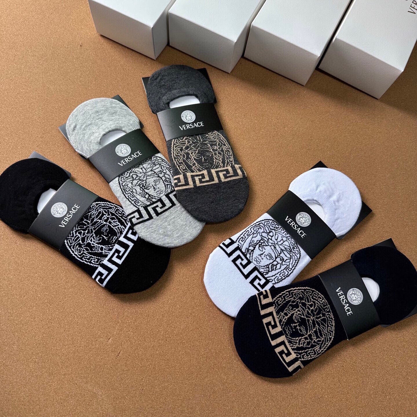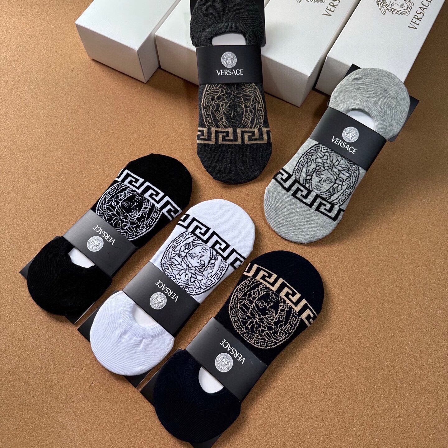 Elevate your sock game with our Versace Men's Invisible Boat Socks, available in a convenient pack of five. Crafted from 100% pure cotton, these socks offer unrivaled softness and comfort for all-day wear. Featuring the iconic jacquard logo, they add a touch of luxury to your wardrobe. Perfect for fashion enthusiasts and easy to pair with any outfit, these invisible boat socks are a must-have accessory for any stylish man.