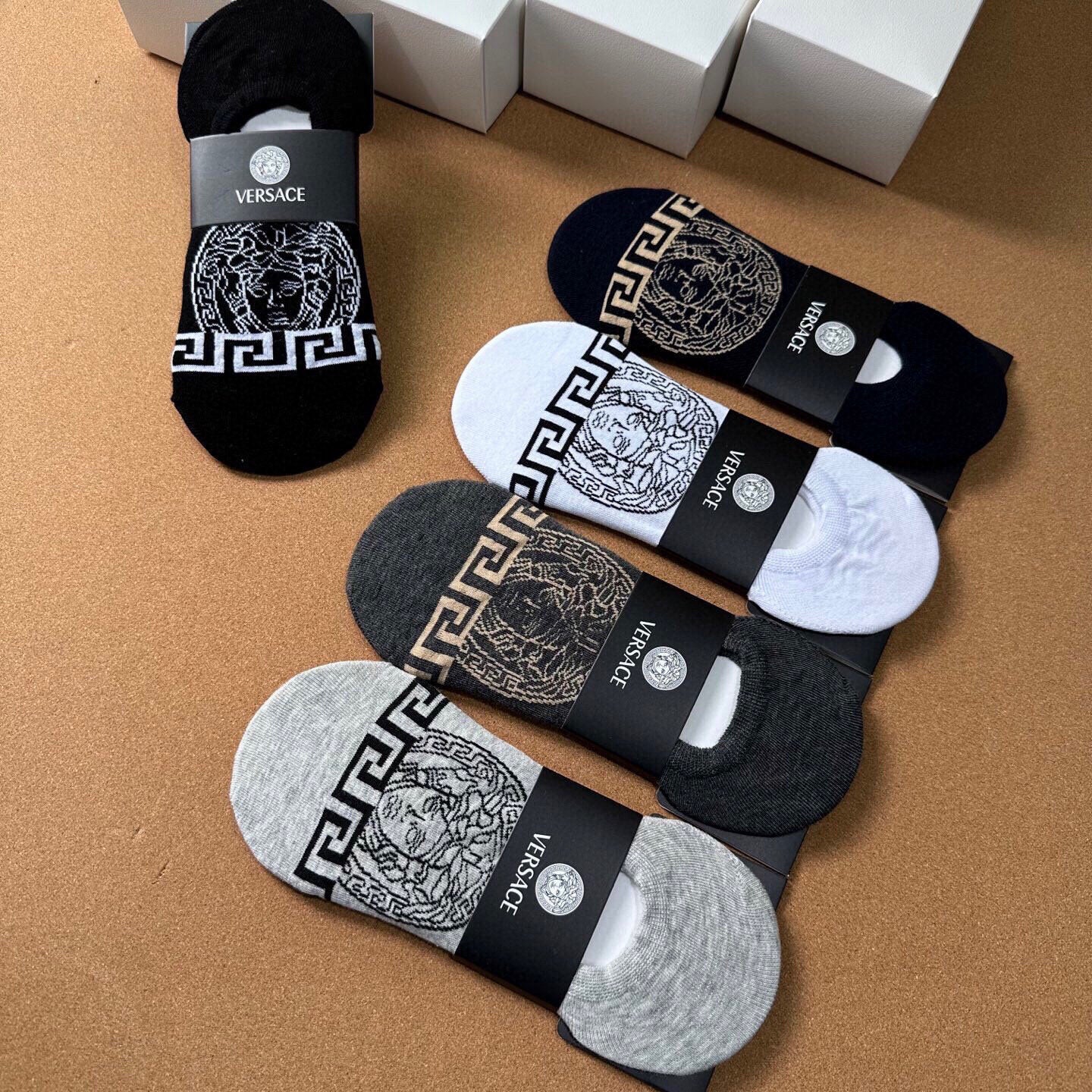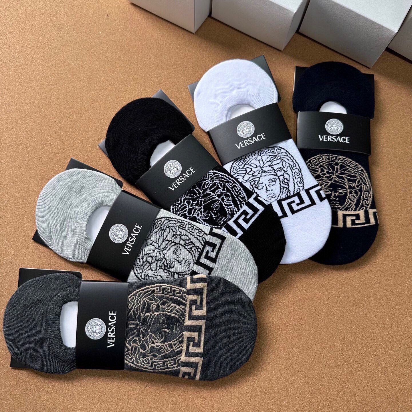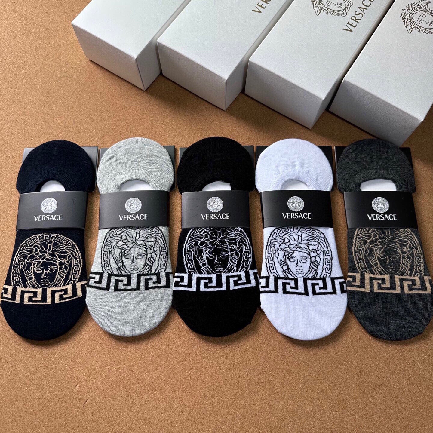 Elevate your sock game with our Versace Men's Invisible Boat Socks, available in a convenient pack of five. Crafted from 100% pure cotton, these socks offer unrivaled softness and comfort for all-day wear. Featuring the iconic jacquard logo, they add a touch of luxury to your wardrobe. Perfect for fashion enthusiasts and easy to pair with any outfit, these invisible boat socks are a must-have accessory for any stylish man.