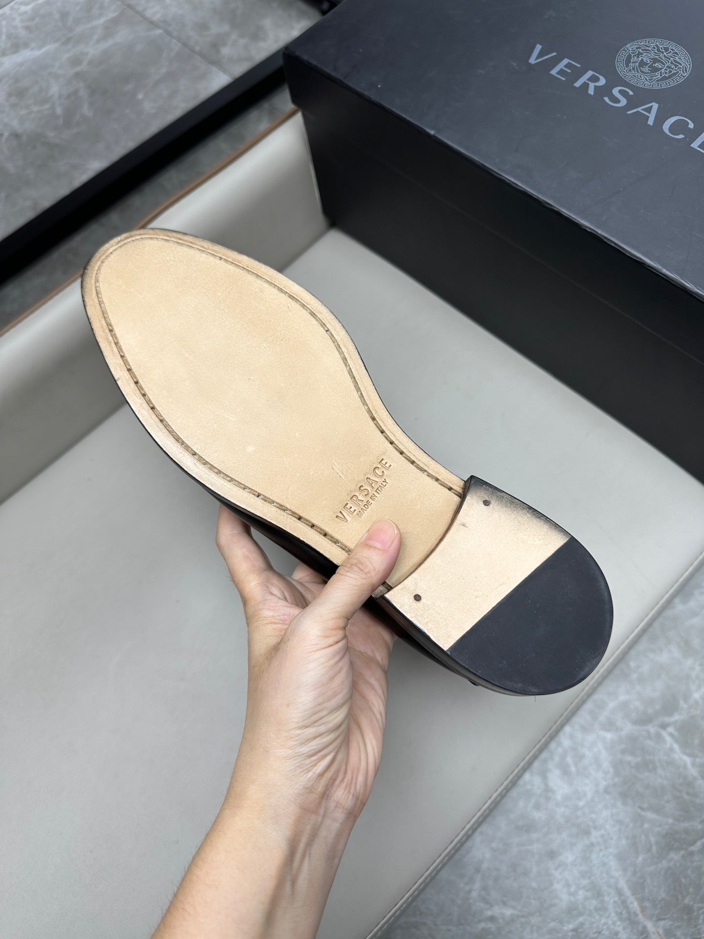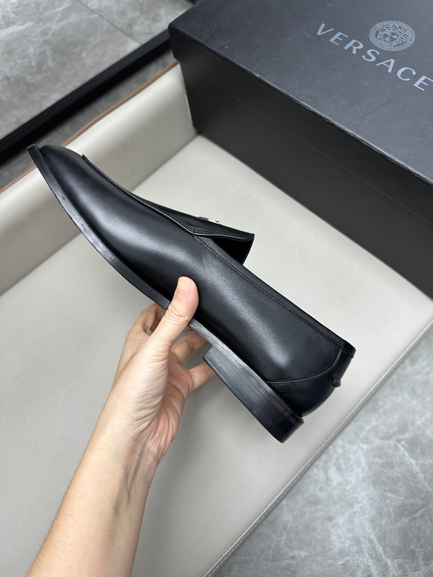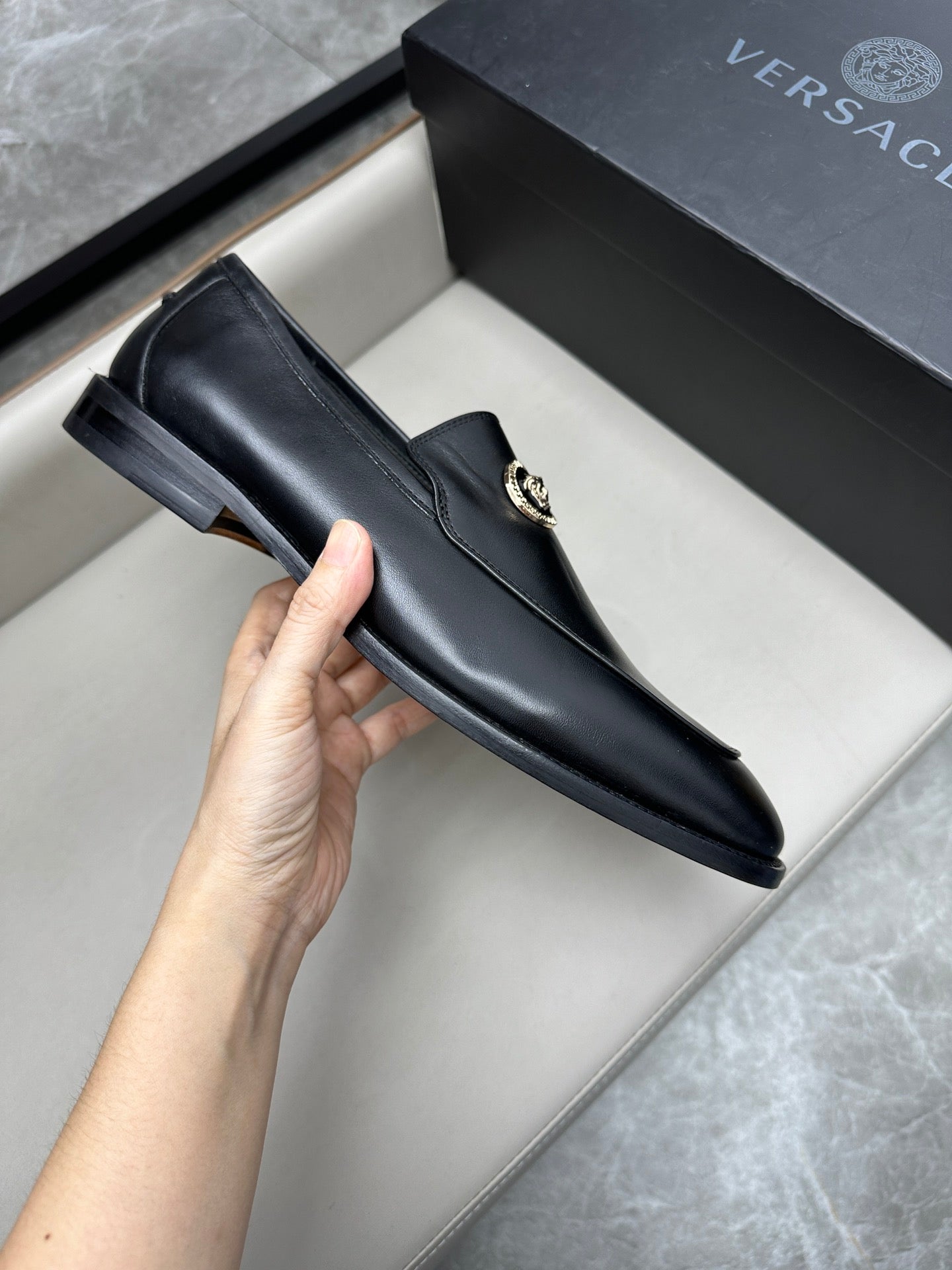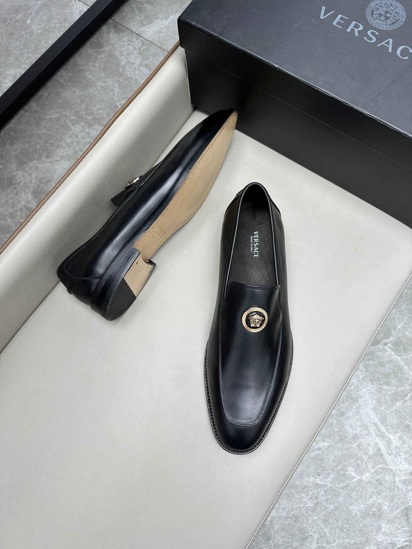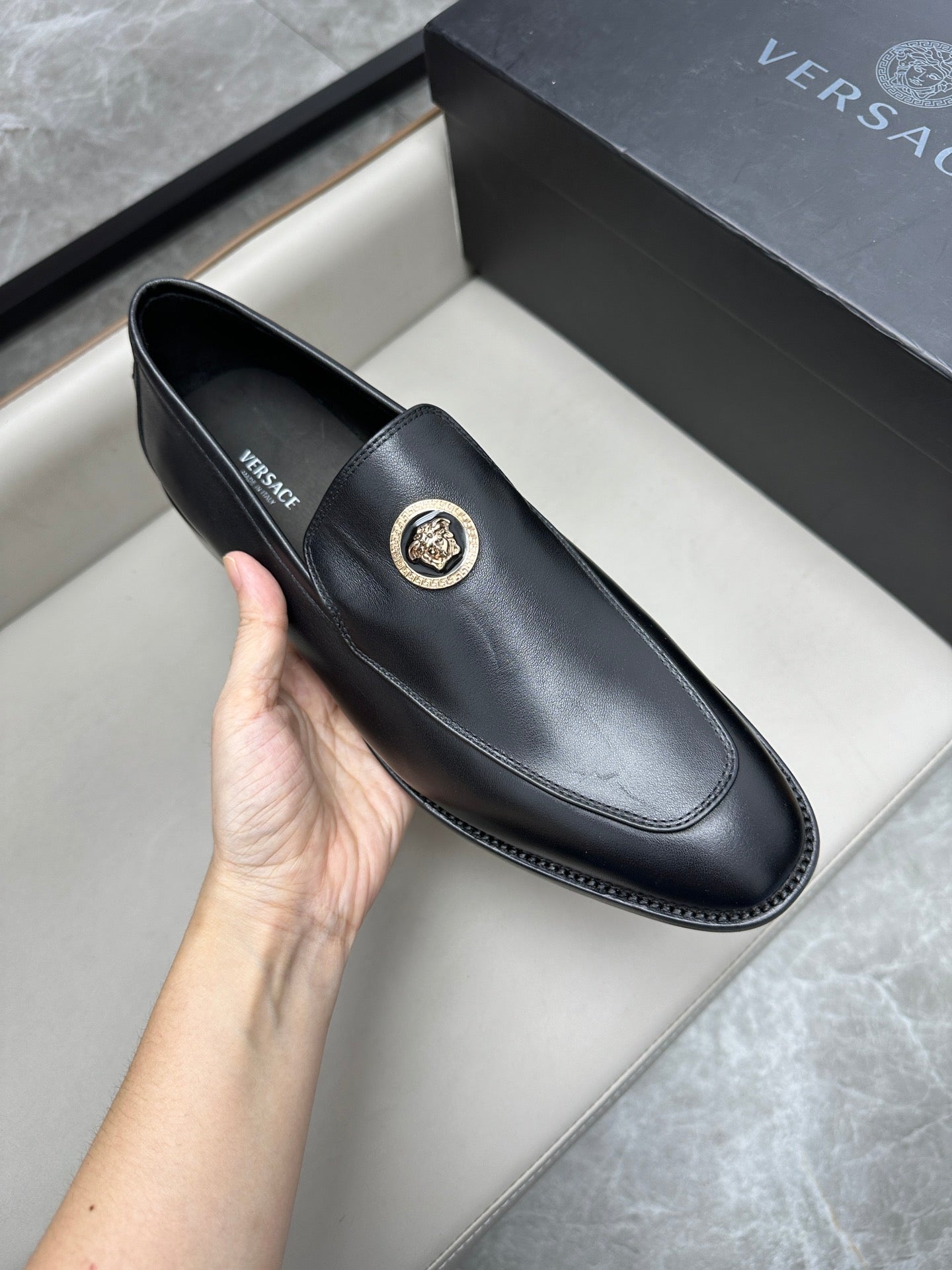 Elevate your formal attire with Versace Men's Luxury Leather Business Shoes. Expertly crafted from imported calfskin and featuring genuine leather soles, these shoes combine elegance with durability. With exclusive branded insoles and a soft cowhide lining, they ensure comfort without compromising on style. Available in sizes 39 to 44, with custom options in sizes 38, 45, and 46 to suit your needs. Step into sophistication with Versace.