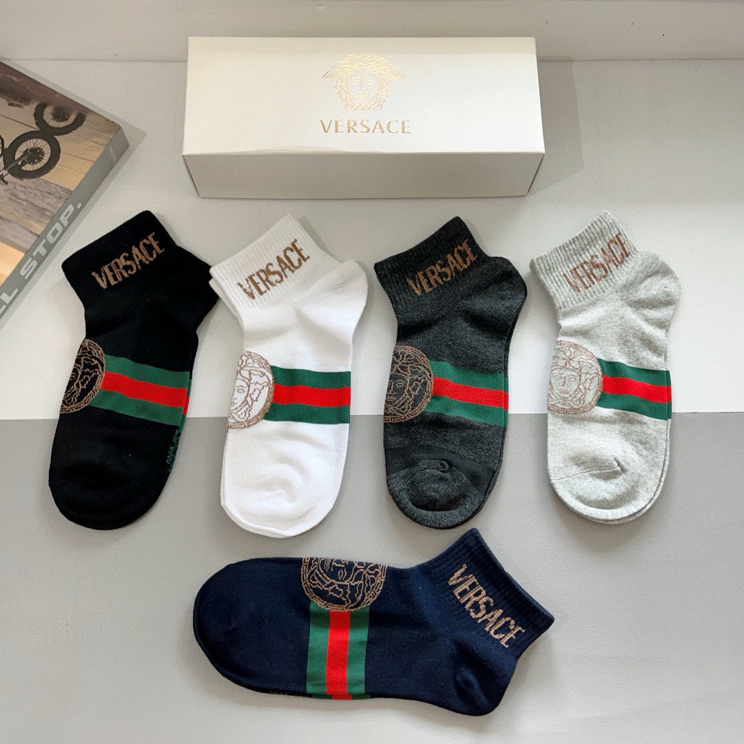 Elevate your wardrobe with our Versace Short Socks, a luxury essential for fashion enthusiasts. Each box includes five pairs of these high-quality socks, designed to complement both European and American styles. Perfect for adding a touch of sophistication to any outfit, these trendy socks are a must-have accessory for those who value style and comfort. Treat yourself or someone special to this curated collection - where fashion meets functionality.