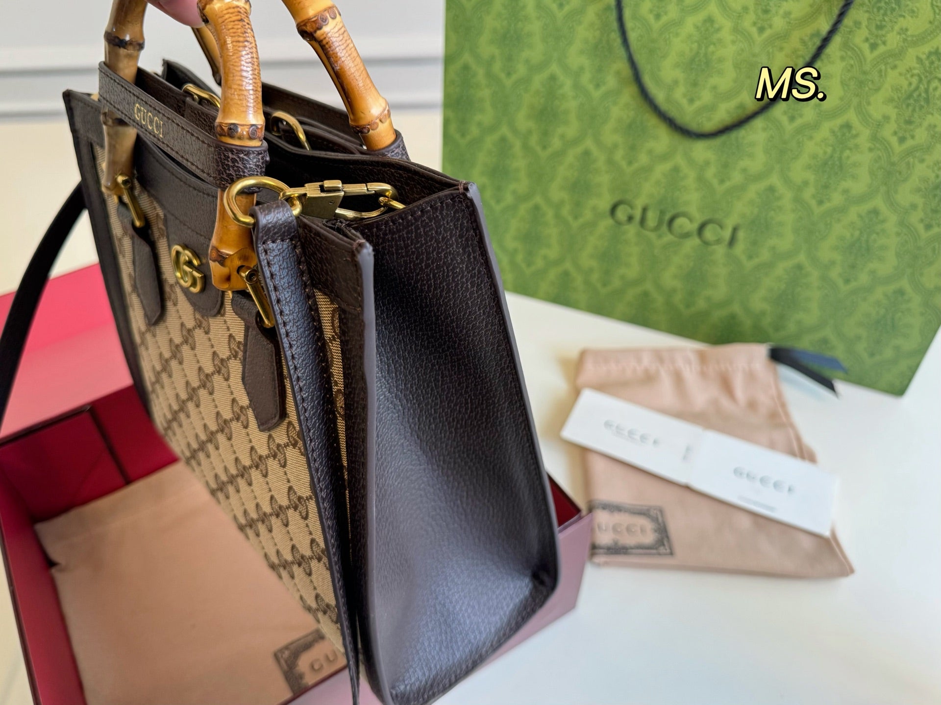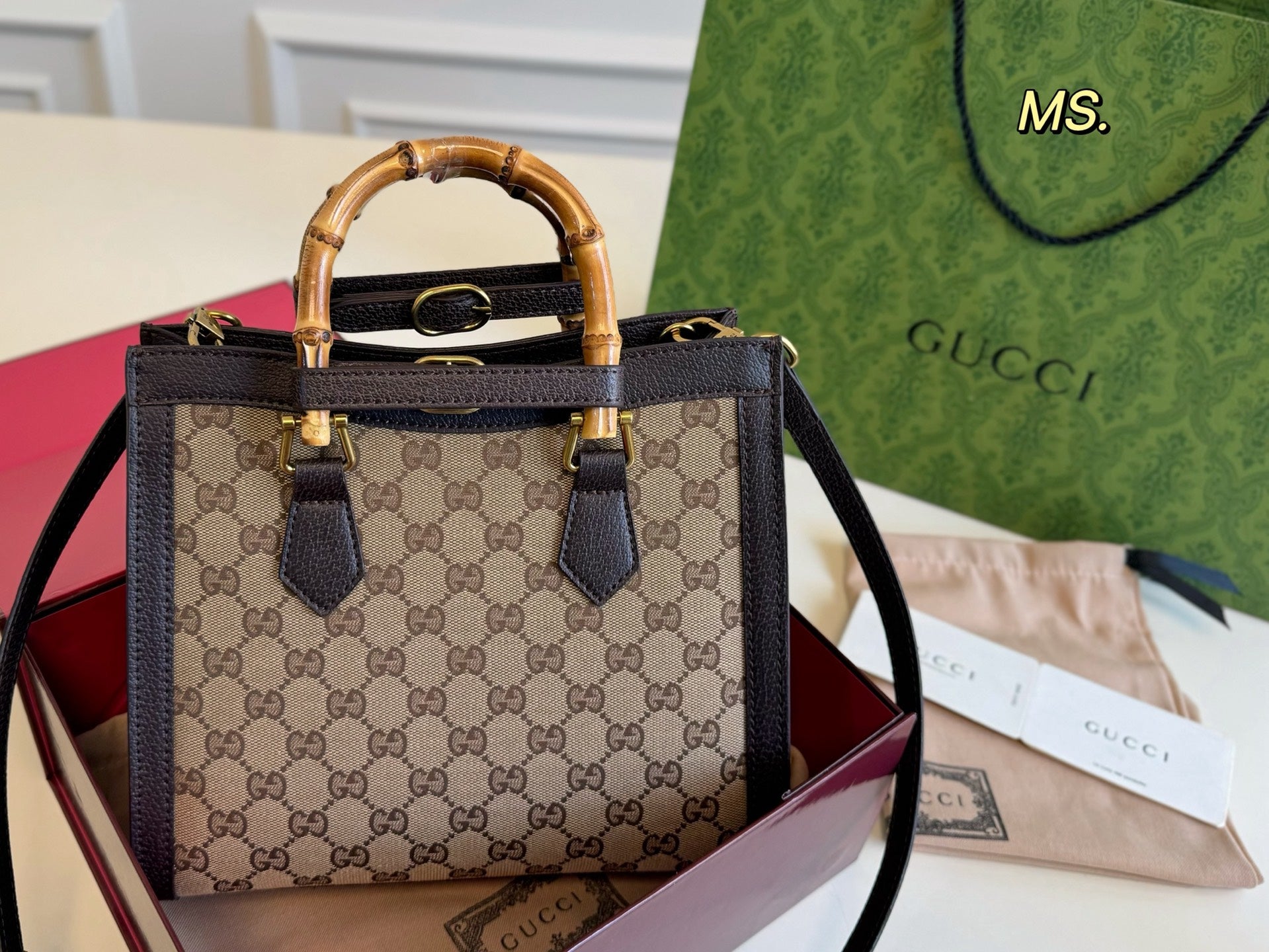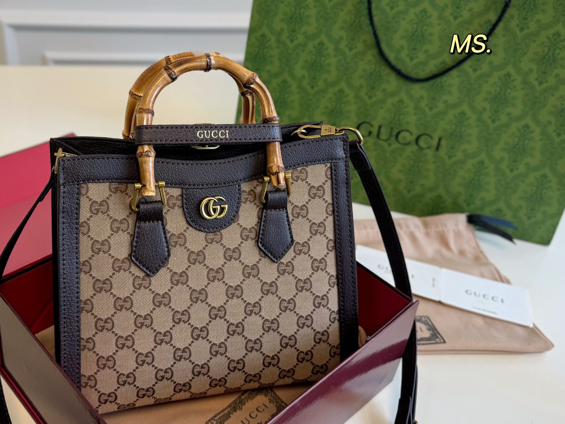 Elevate your accessory collection with the Vintage Gucci Diana Bamboo Tote Bag. Measuring 27x23 cm, this elegant bag features a distinctive bamboo knot, symbolizing over fifty years of luxury craftsmanship. Its understated bamboo handle not only adds a touch of sophistication but also stands the test of time.