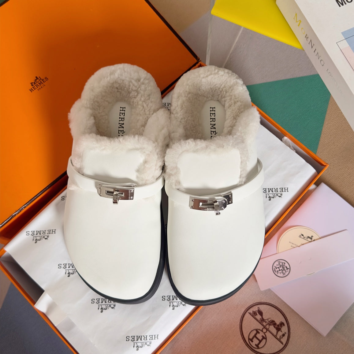 Women's Hermès Kelly Buckle Teddy Mules - Luxury Suede & Shearling Slippers