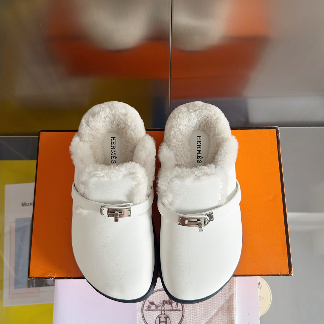 Elevate your style with the Hermès Kelly Buckle Teddy Mules, the latest addition to our luxury couple collection. These exquisite slippers are crafted from premium suede goatskin and shearling, featuring the iconic "H" shaped upper for a classic touch. Designed for ultimate comfort, they provide a cloud-like feel, making them perfect for both barefoot and socked wear.