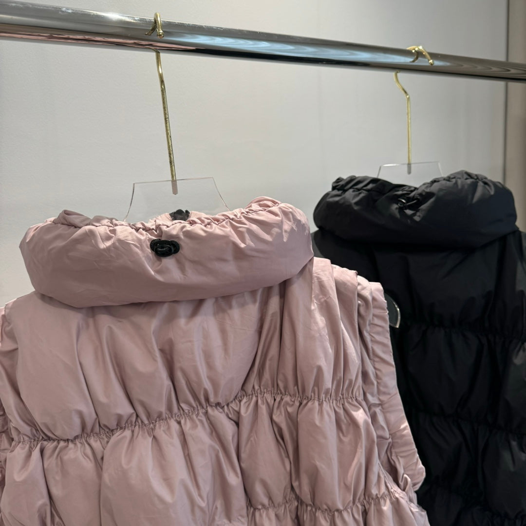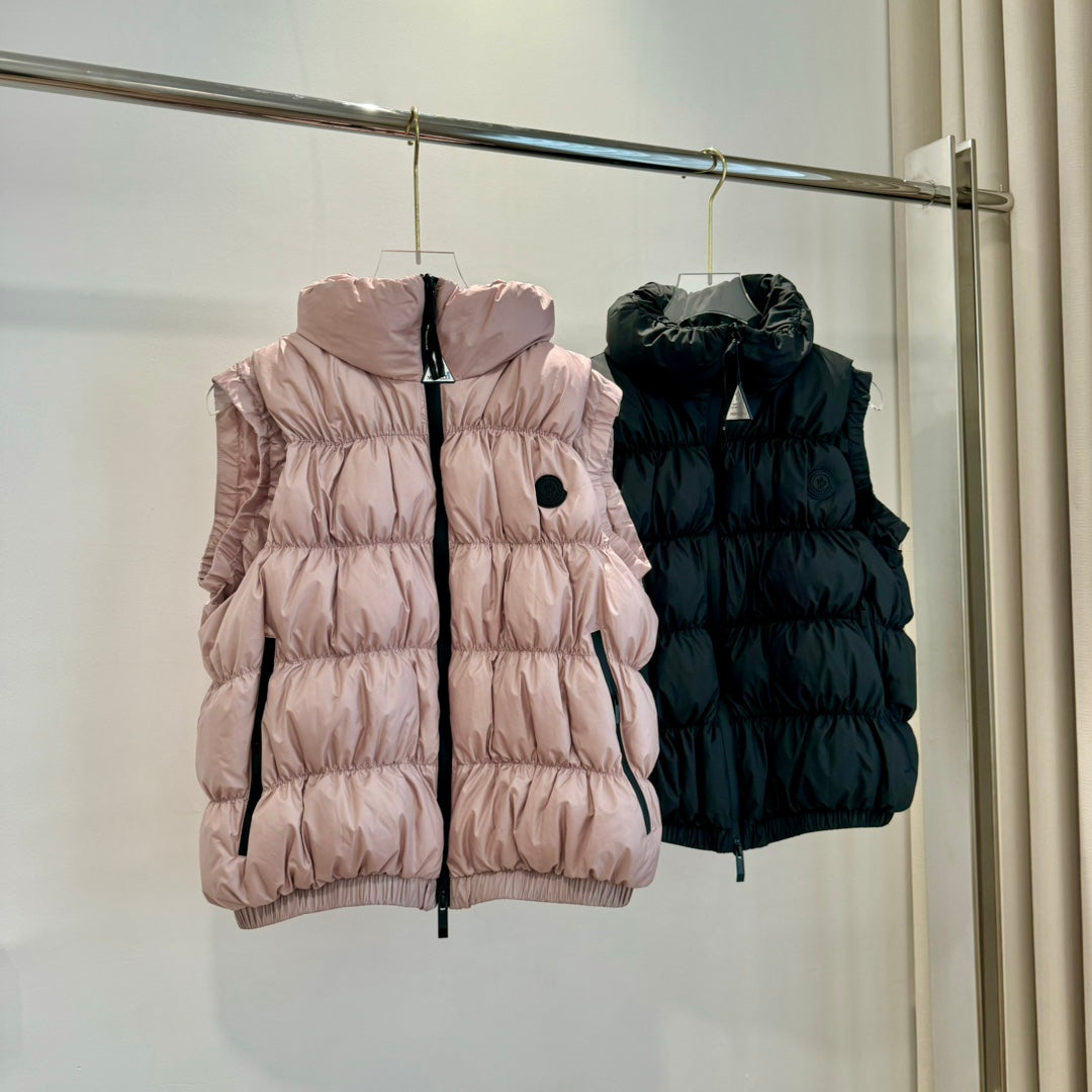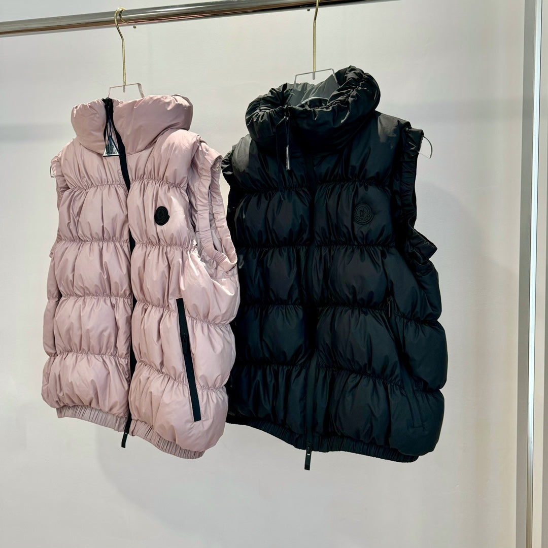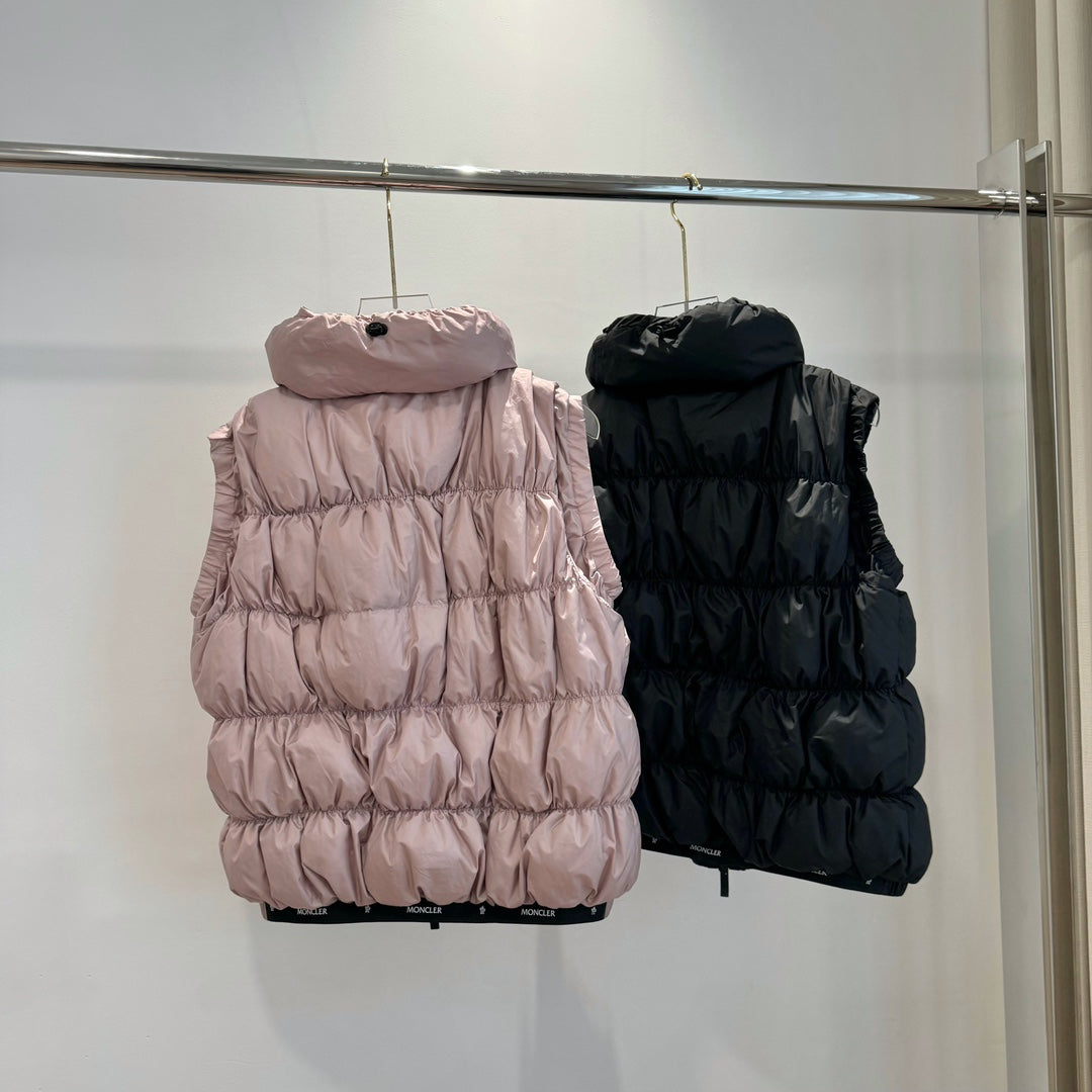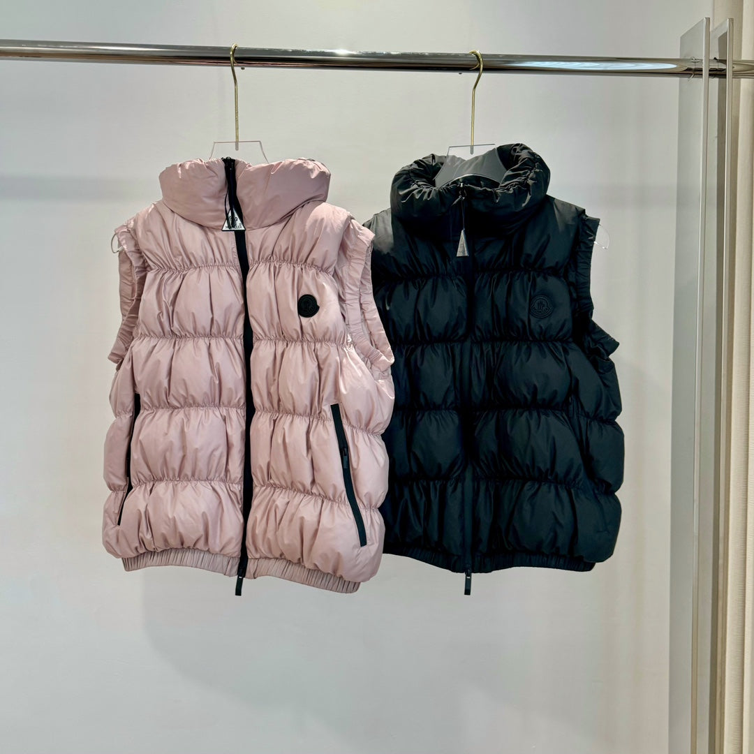Elevate your winter wardrobe with our women's down vest from the Moncler FW Autumn/Winter Collection. This stylish vest features a charming pleated design that combines functionality with a playful aesthetic. Available in two elegant colors: light pink and classic black, it's perfect for layering or wearing on its own.
