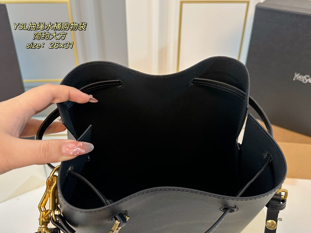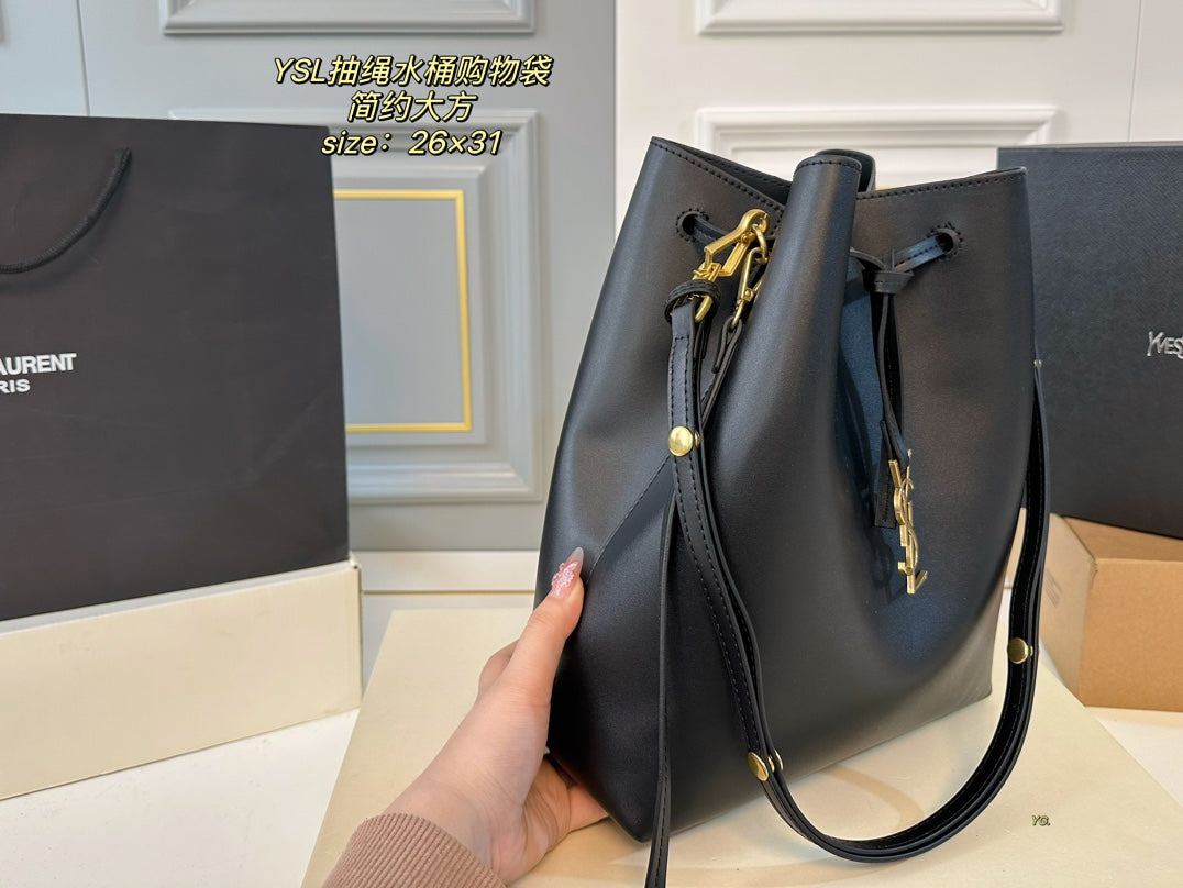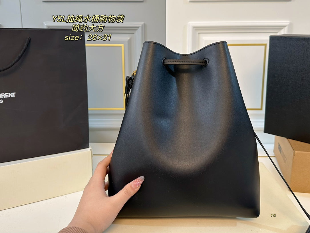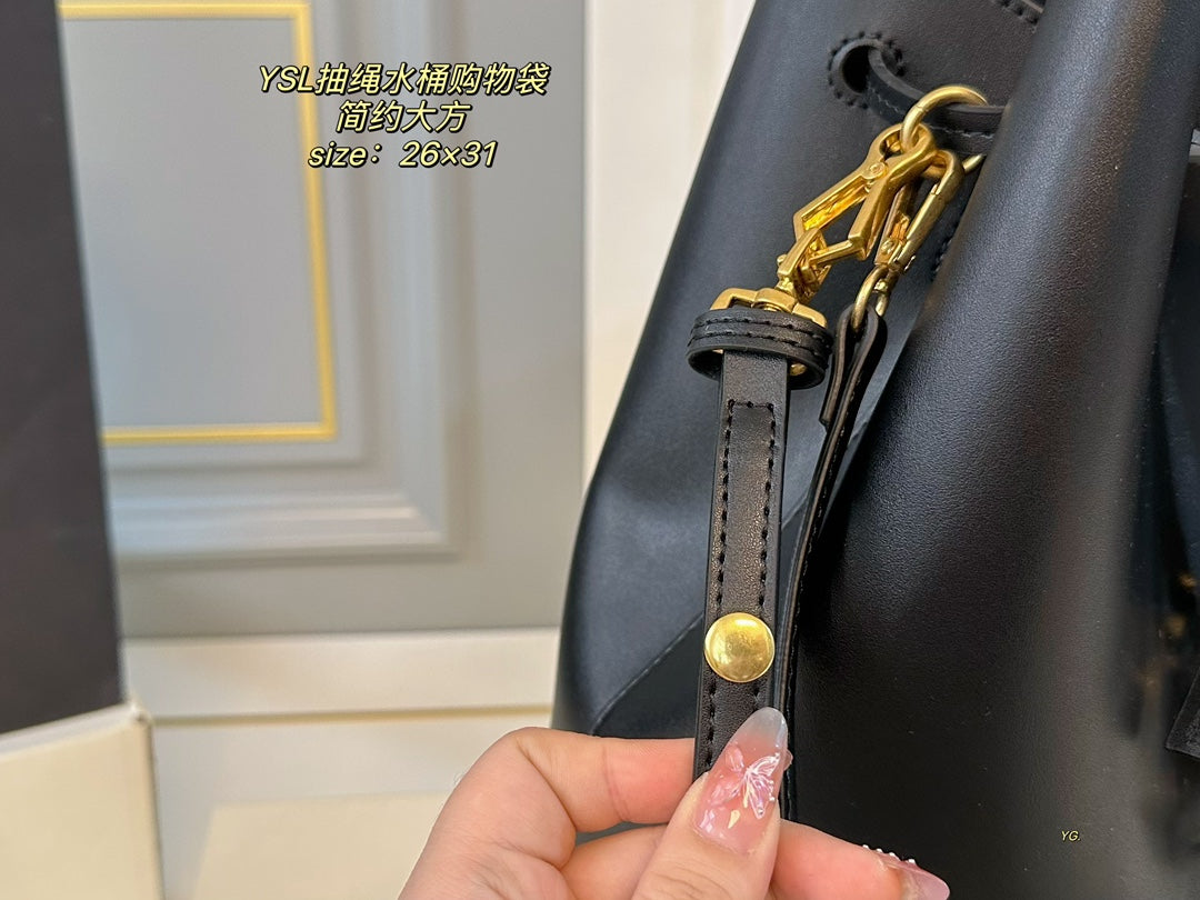 Elevate your style with the YSL Saint Laurent Drawstring Bucket Bag, designed for both functionality and fashion. Measuring 26×31 cm, this bag features a sleek, minimalist aesthetic crafted from high-quality materials that provide a luxurious feel.