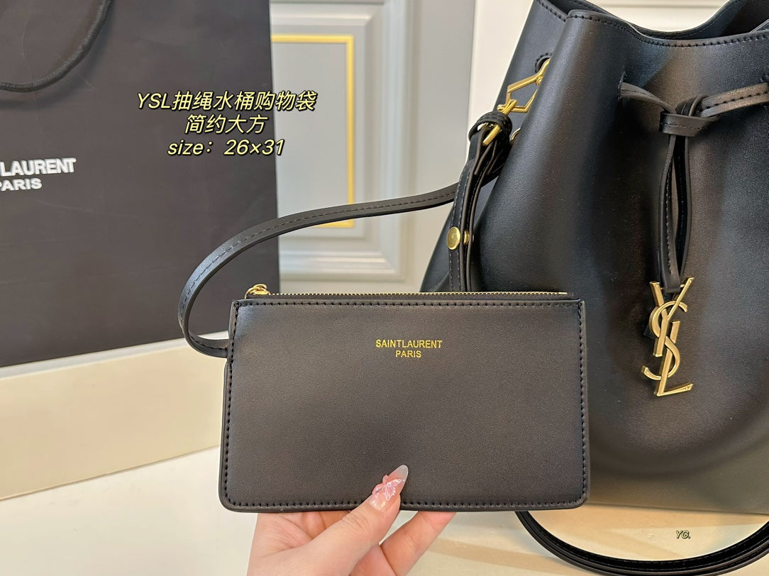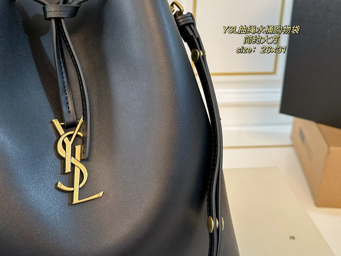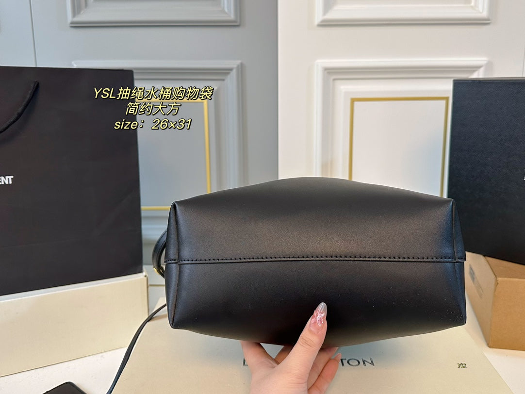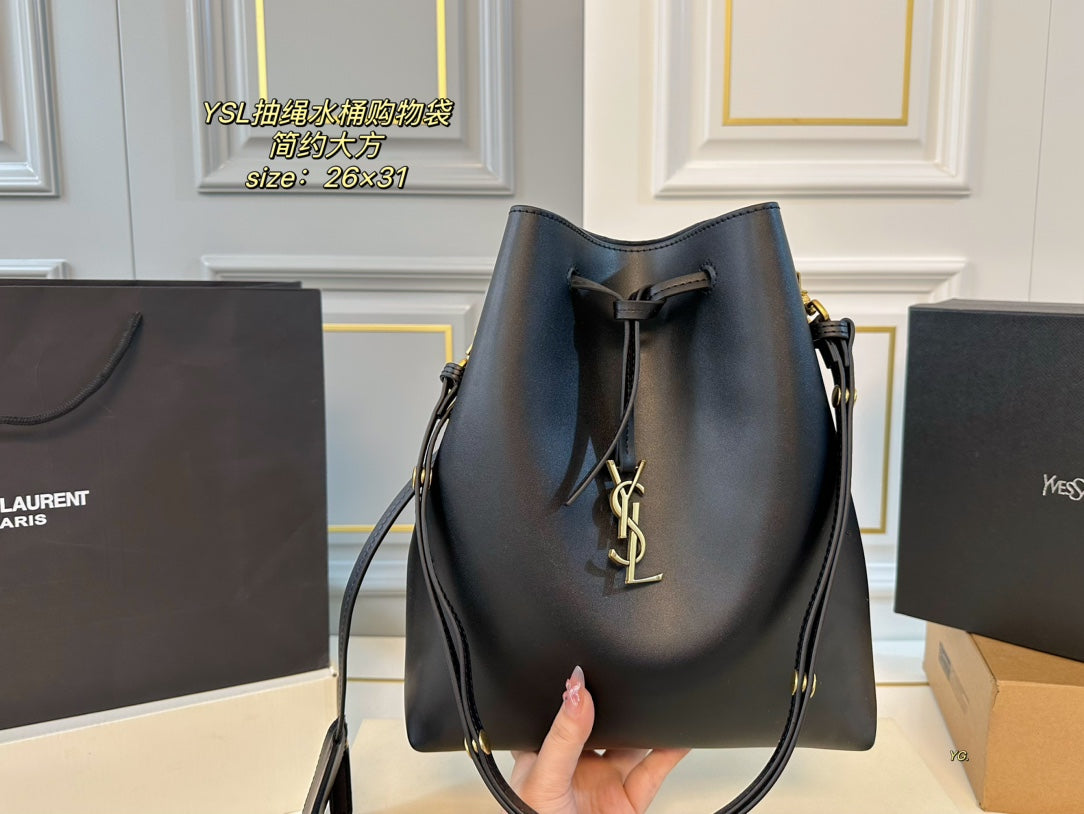 Elevate your style with the YSL Saint Laurent Drawstring Bucket Bag, designed for both functionality and fashion. Measuring 26×31 cm, this bag features a sleek, minimalist aesthetic crafted from high-quality materials that provide a luxurious feel.