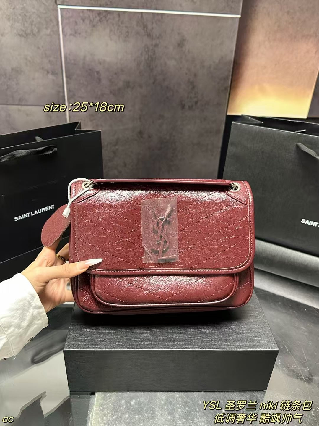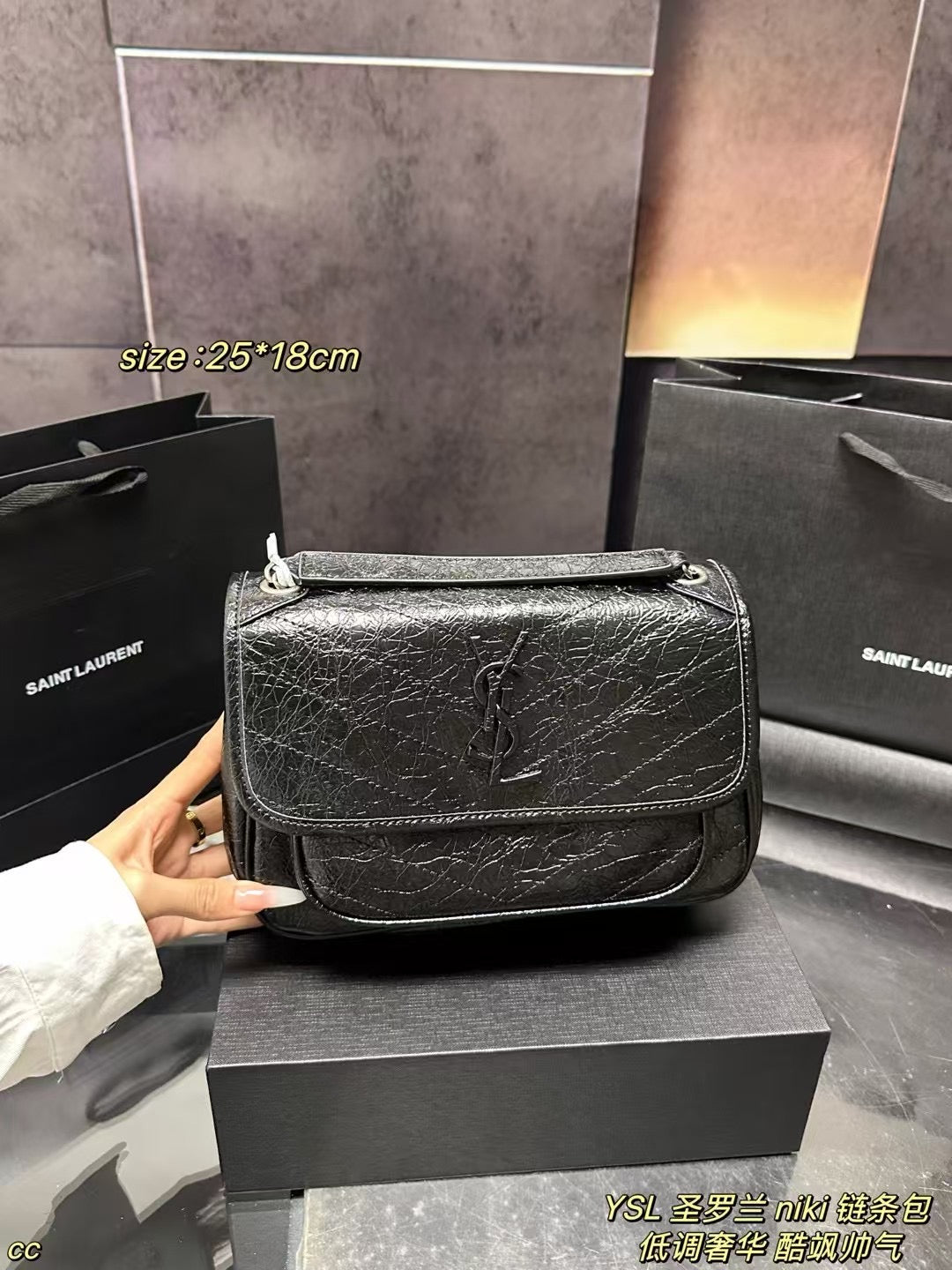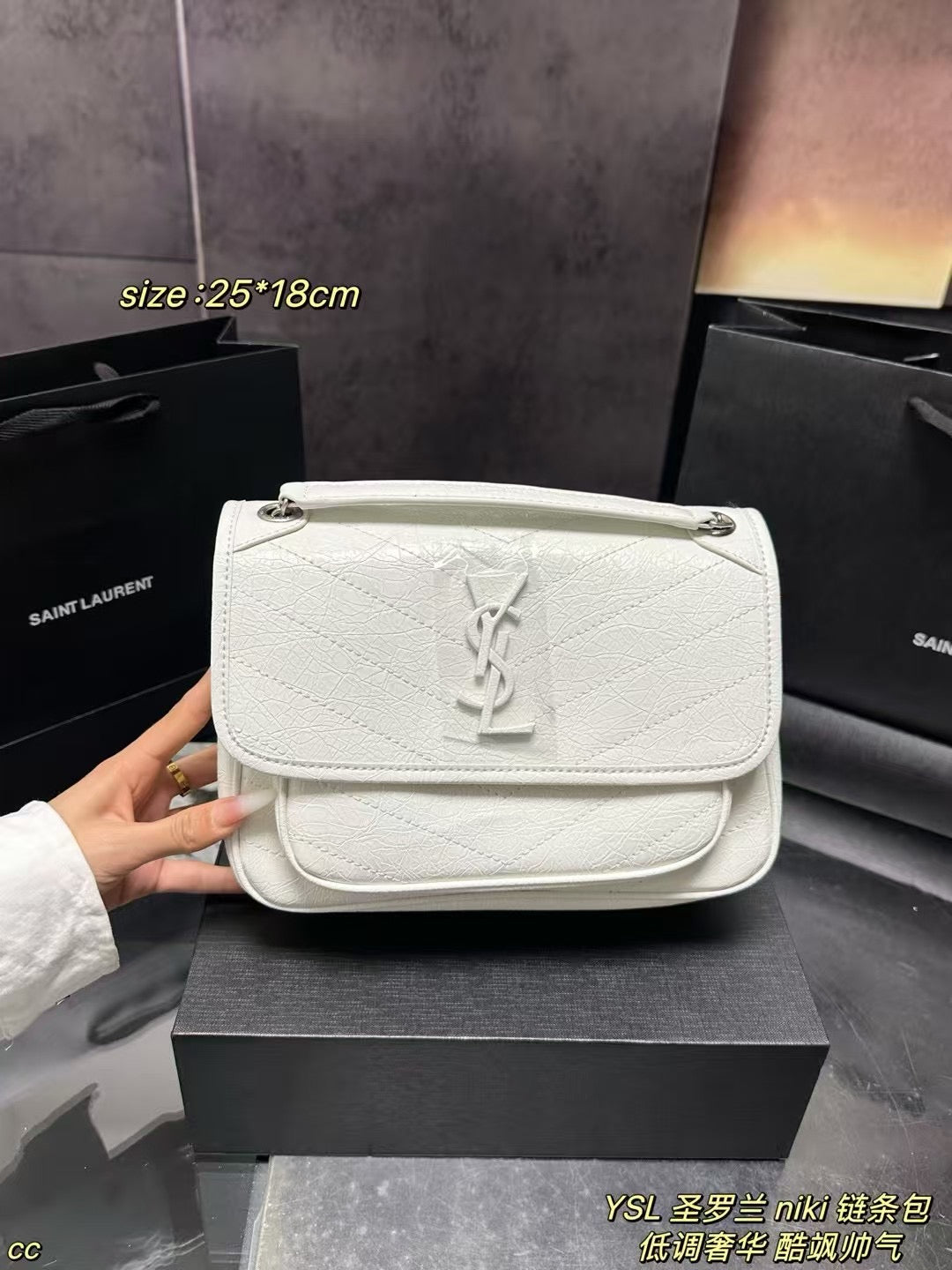 With dimensions of 25x18 CM, it provides ample room for your essentials without compromising on style. Whether you're dressing up for a special occasion or heading out for a casual day, this bag is your go-to accessory. Highly recommended for those who exude a cool, effortlessly stylish vibe. Elevate your accessory game with the YSL Niki Chain Bag—where sophistication meets versatility.